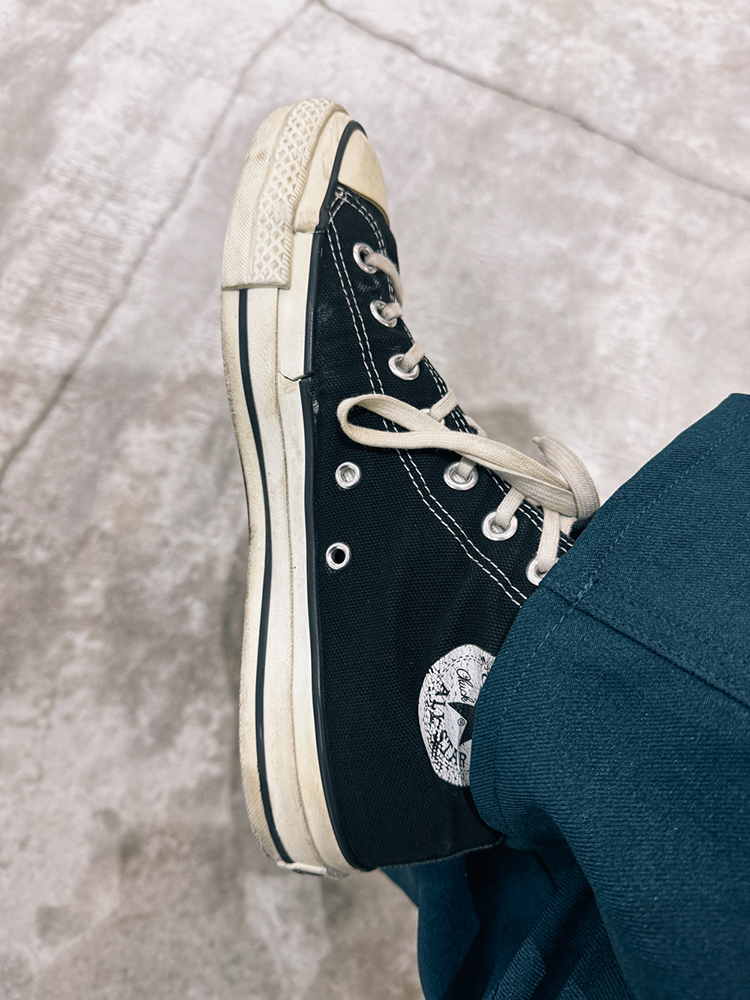 オールスターの踵がすり減ってることに稲葉に言われて気付きました。 ひび割れも数か所。 WACKOとCONVERSE、発売は10年前?くらいか。 せっかくWACKO から再入荷しているし、買い替えればいいんだろうけど、どうもピカピカのオールスターは履く気になれません。 山下 https://kaddish.jp/blog/98806