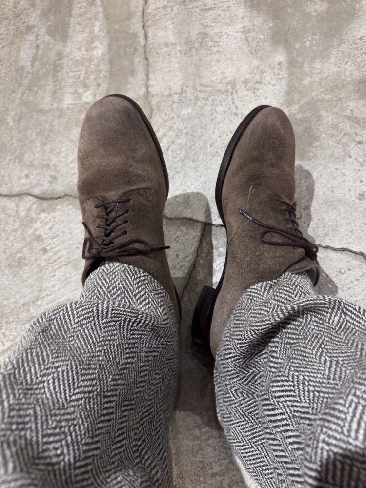 ブラウン?グレー?なんと形容していいのか分かりませんが、ブラックの次によく手に取る革靴は、こういうはっきりしない色のスェード。