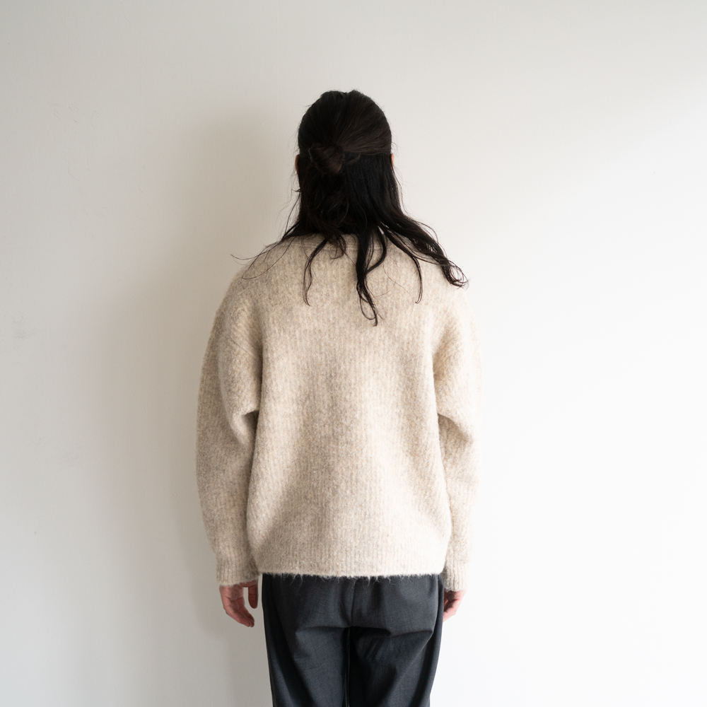 アルパカ70%以上の糸とビックループが印象的なファンシーヤーンを片畦裏使いの引き揃えで3Gで編み上げた。ファンシーヤーンはカラーネップのような色の変化もありより深みのある印象に。軽い印象ながら地厚でしっかりとしたシルエットが特徴。