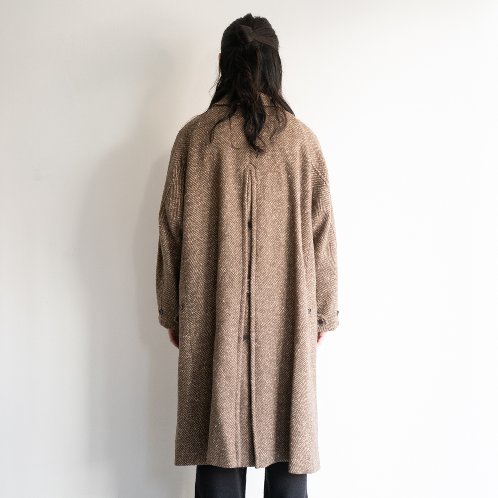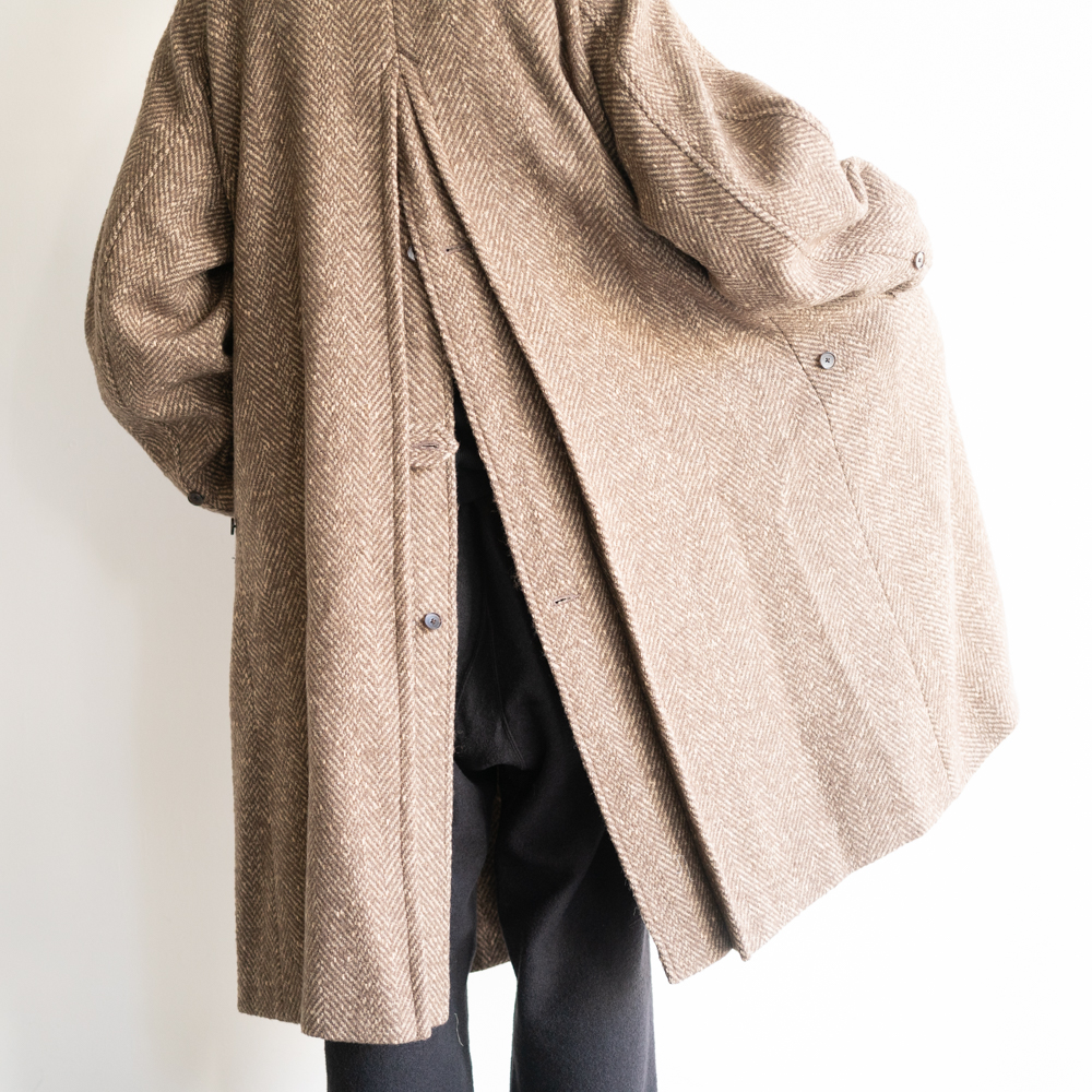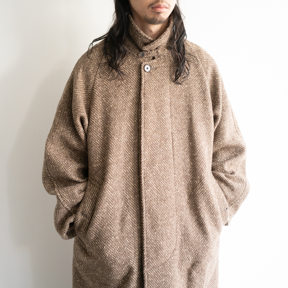 また古き良き時代を彷彿させるかのようなクラシカルな佇まいを持つざっくり編みの太番手ヘリンボーンが目を引く。 4種の糸で構成し織り上げている為、表面の凹凸感が他にない存在感を醸し出します。 凛々しい表情に相反するかのように軽やかな羽織り心地を持つ。 動く度に布が綺麗に舞うようにと、マテリアルのウエイトにまでOLDJOEの意匠設計を垣間見ることができる。