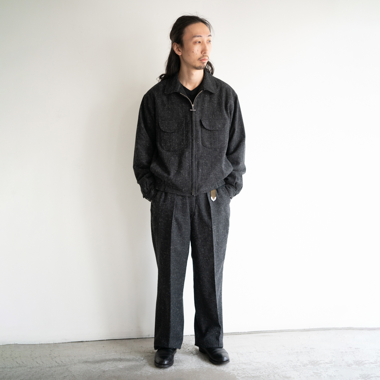 プリーテッドトラウザーとセットアップで組む事のできるトゥーポケットタイプのドレス感漂う新型スゥイングトップ。