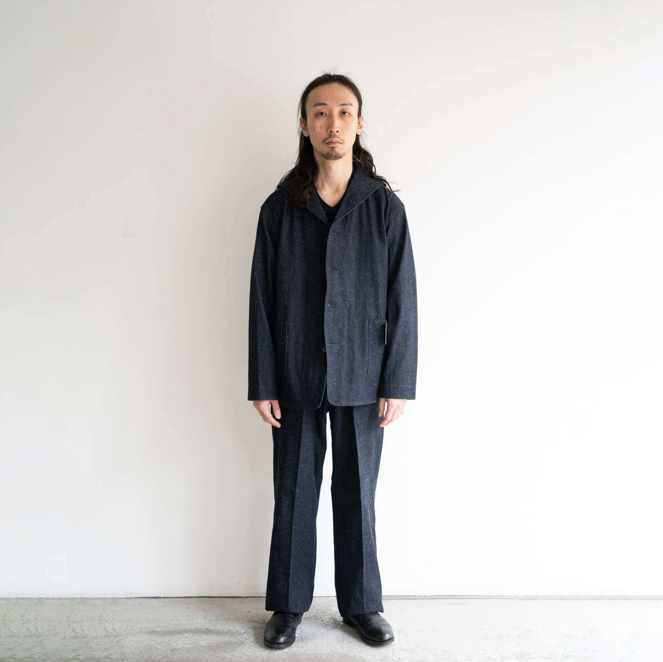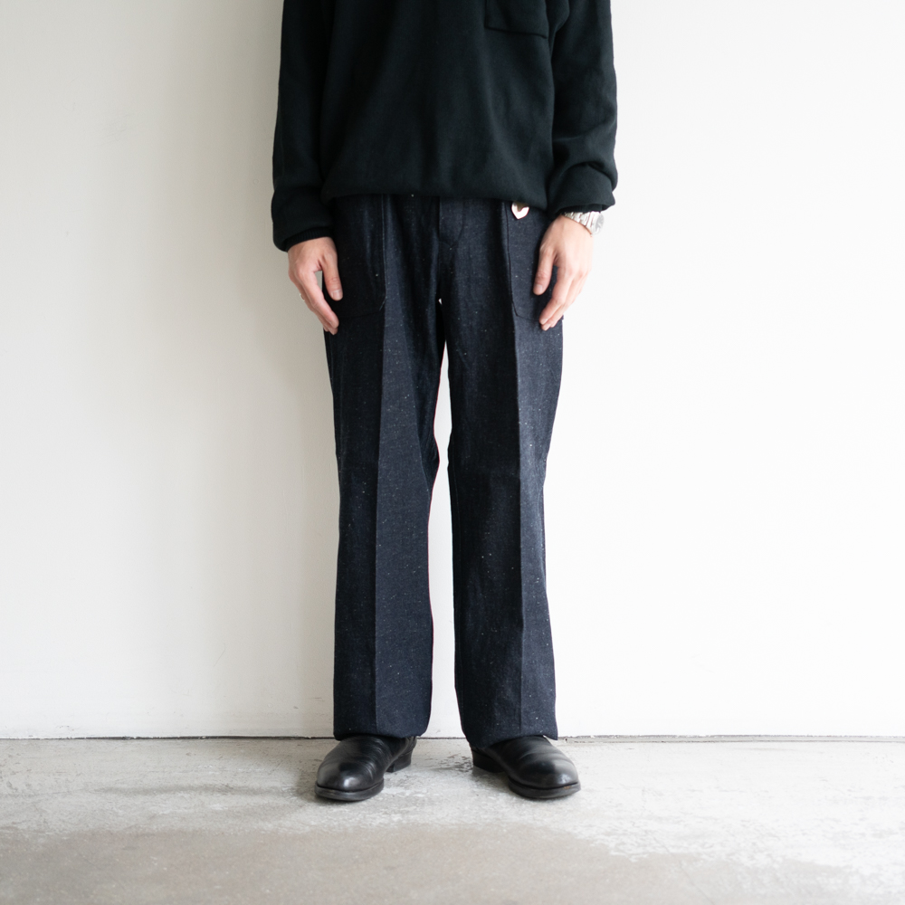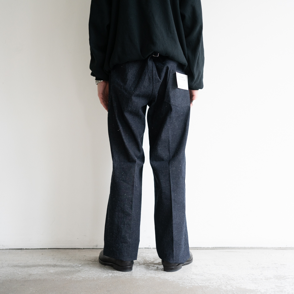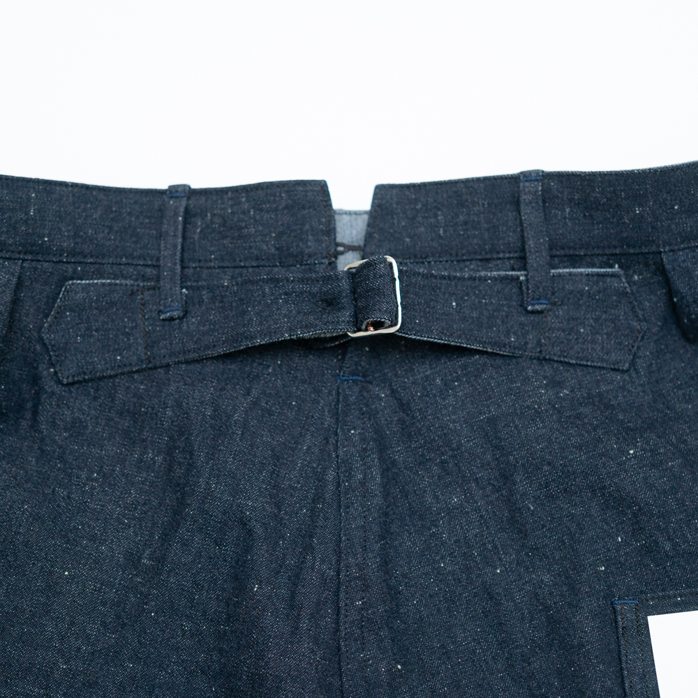 糸に拘り、オリジナルのデシネップを使用しています、 タテ糸は、デニム本来の素朴さやドライ感、バルキー感を表現するために繊維長の短めの綿も混ぜ込んで糸をつくりました。ヨコ糸は、米綿をメインにオーストラリア、ブラジル綿とブレンドし、安定した質感を目指し、また追燃することにより柔らかさの中にシャリ感をだしています。ロープ染色は黒味の強いインディゴ染料で染色し、深い色目を表現しています。 生地はいわゆるキバタと言われる織り上がった状態のものから、特殊な方法でサンフォライズ(防縮加工)のみをかけています。キバタの風合いを損なわず、表面の毛羽感も残しました。