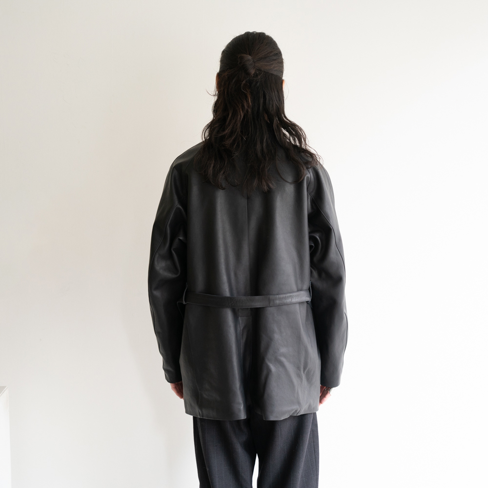 美しいアールを持つ襟からラペルにかけて滑らかに繋がるライン、ウエストのナローベルトなど