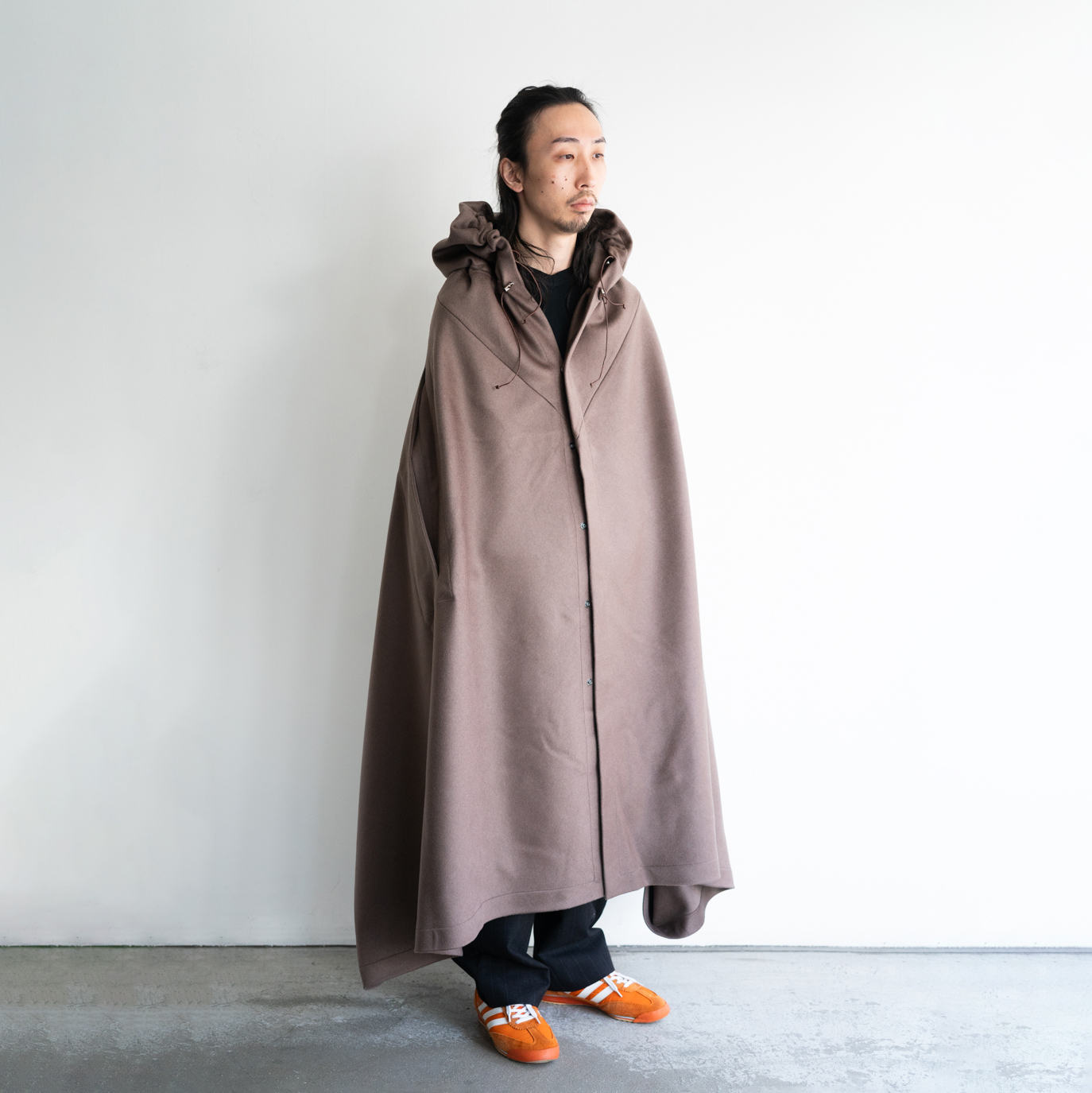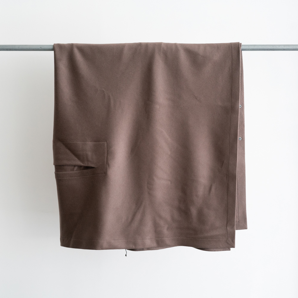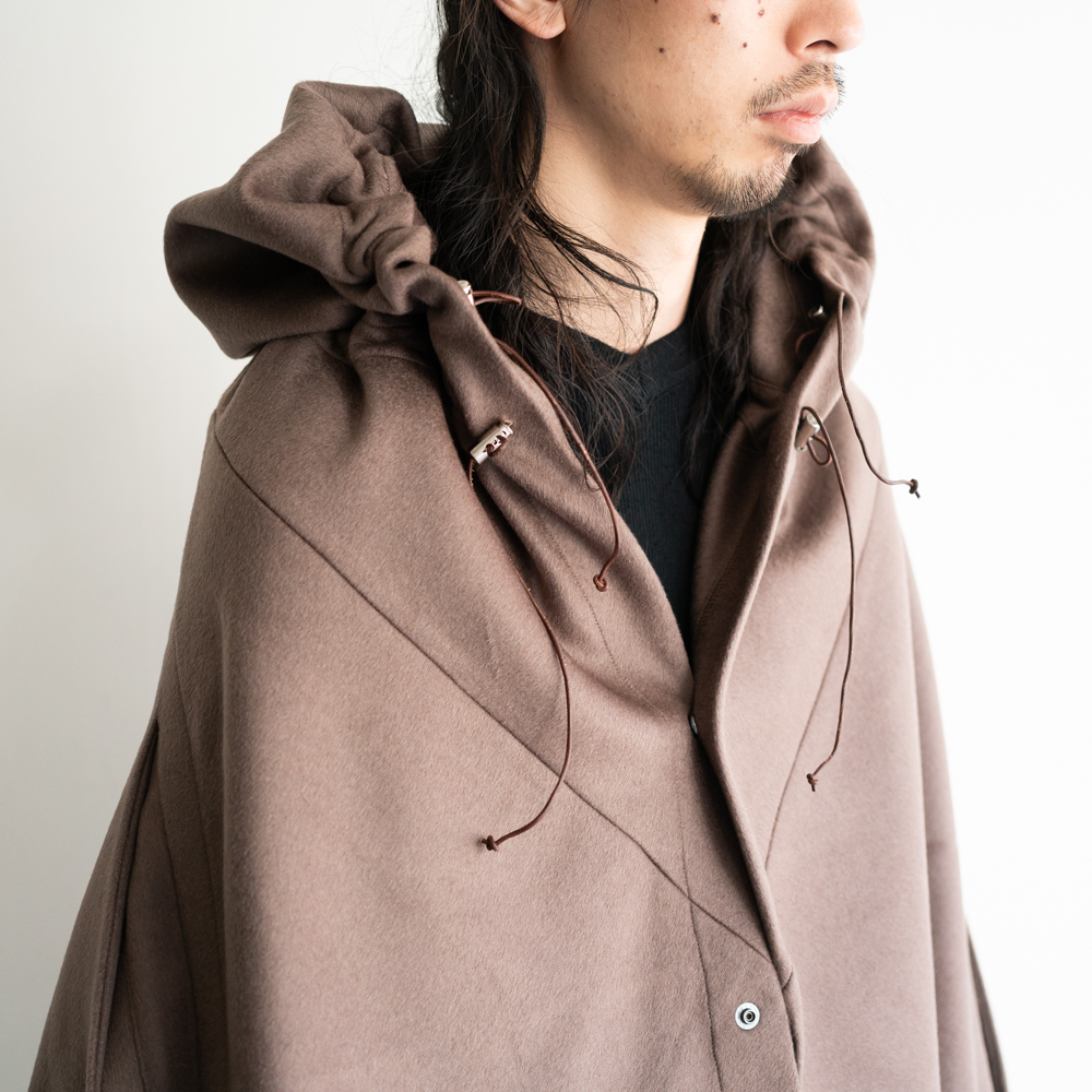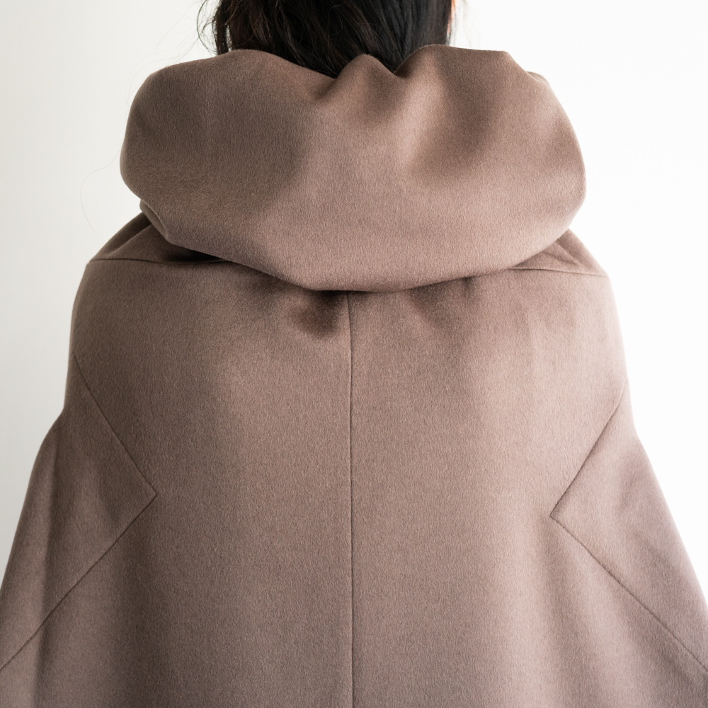 ヨーロッパのミリタリーポンチョからインスピレーションを得て制作した、ウールカシミアのマント。