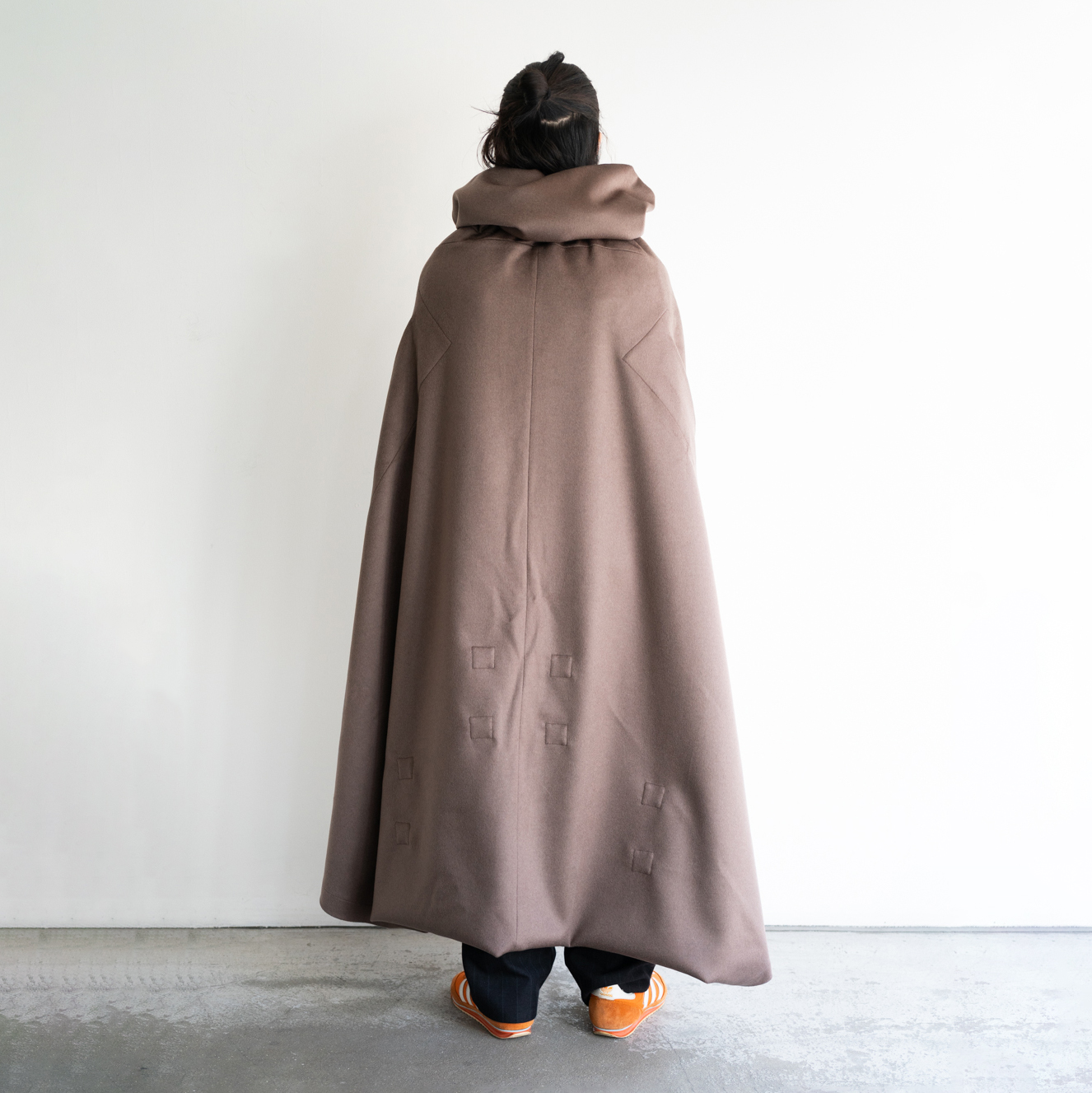 正方形の生地が、スリットとドローコードによって外套に変形します。