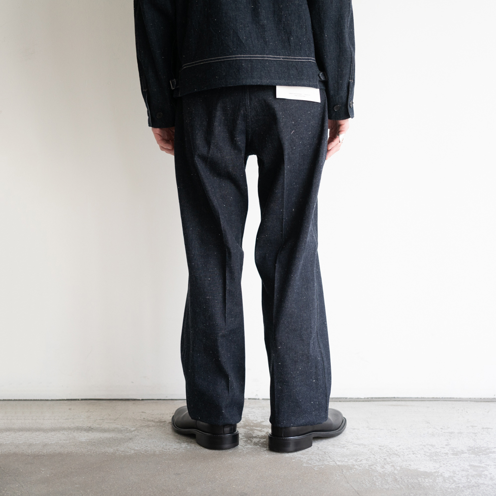 糸に拘り、オリジナルのデシネップを使用しています、 タテ糸は、デニム本来の素朴さやドライ感、バルキー感を表現するために繊維長の短めの綿も混ぜ込んで糸をつくりました。ヨコ糸は、米綿をメインにオーストラリア、ブラジル綿とブレンドし、安定した質感を目指し、また追燃することにより柔らかさの中にシャリ感をだしています。ロープ染色は黒味の強いインディゴ染料で染色し、深い色目を表現しています。 生地はいわゆるキバタと言われる織り上がった状態のものから、特殊な方法でサンフォライズ(防縮加工)のみをかけています。キバタの風合いを損なわず、表面の毛羽感も残しました。