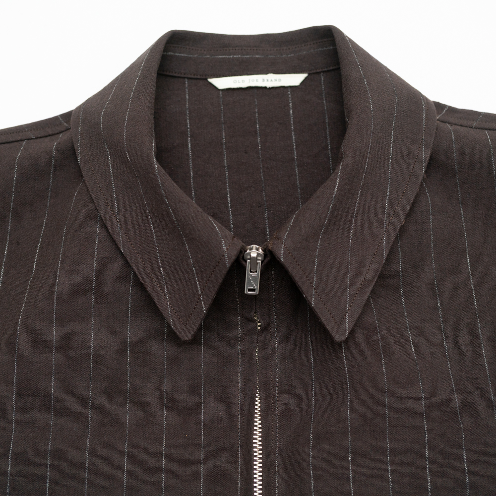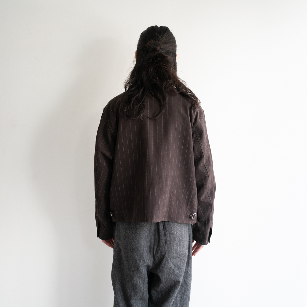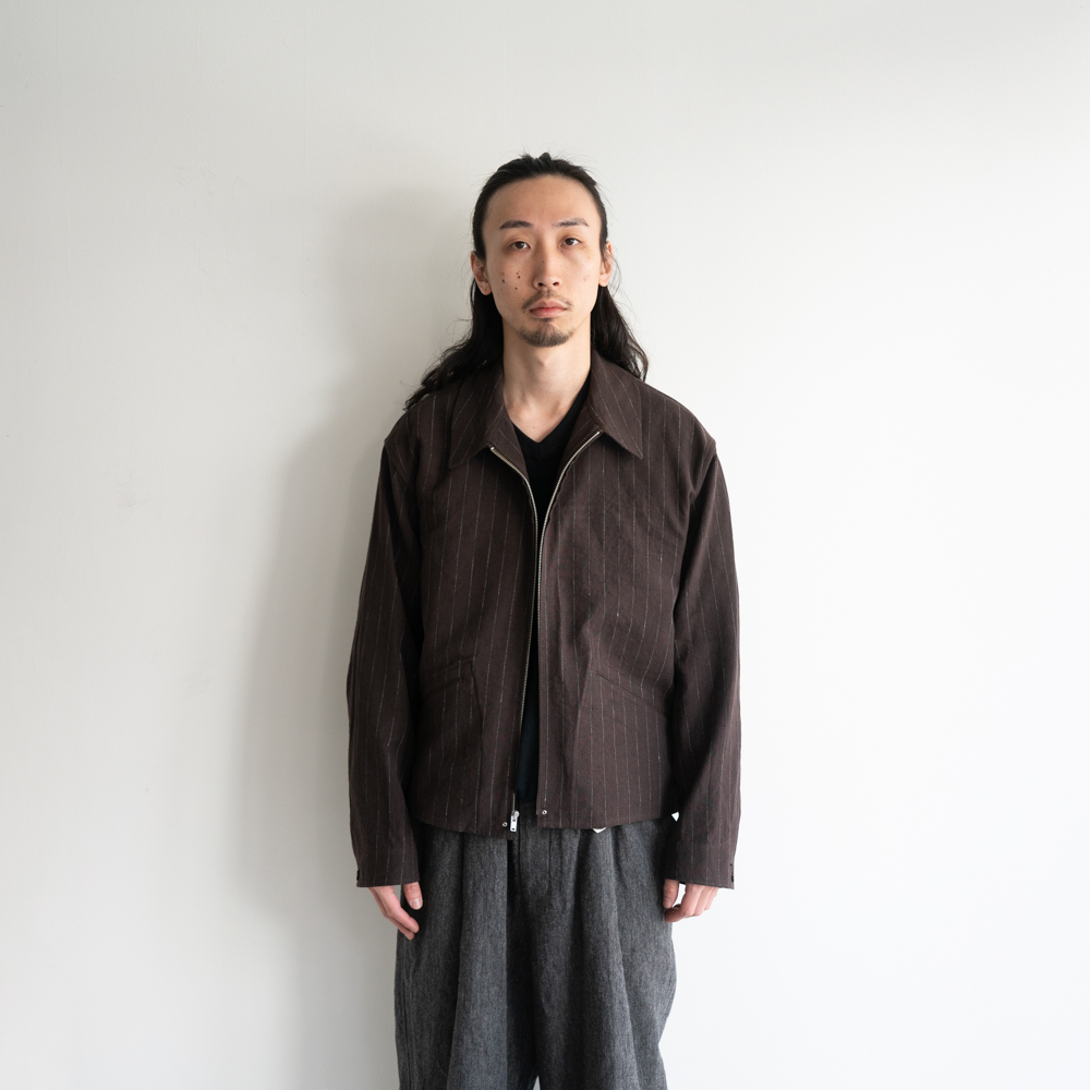 ジャスペヤーンを用いて織り上げたハケ目組織とストライプは、古き良き表情と奥行きのある表情を持つ。