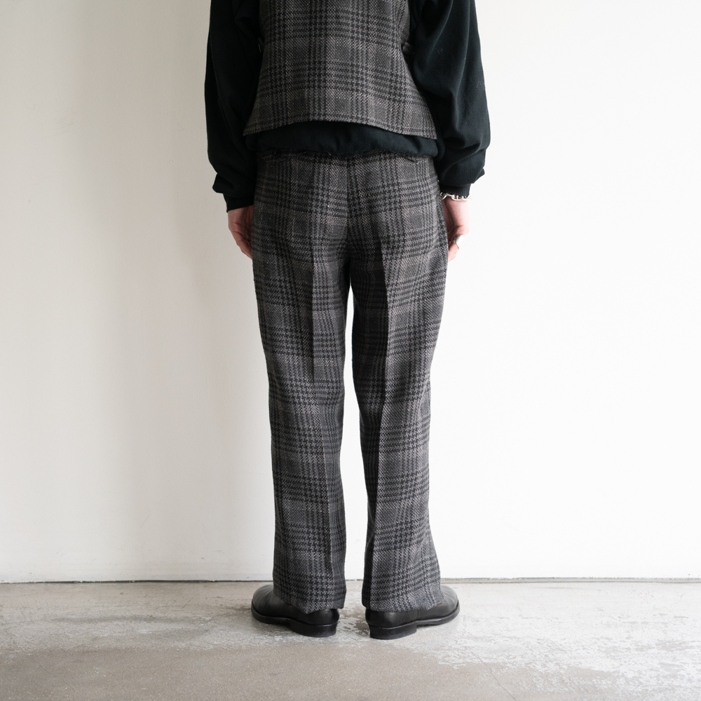 深い股上と、ゆとりを持たせたもも周り、ワイドなわたり巾から膝から裾まで絞れる事ない綺麗なストレートラインは革靴やブーツは勿論、スニーカーなどとの相性も良くサスペンダーで吊るして履くと、ハイウエストで更に綺麗な脚のラインをキープしてくれます。