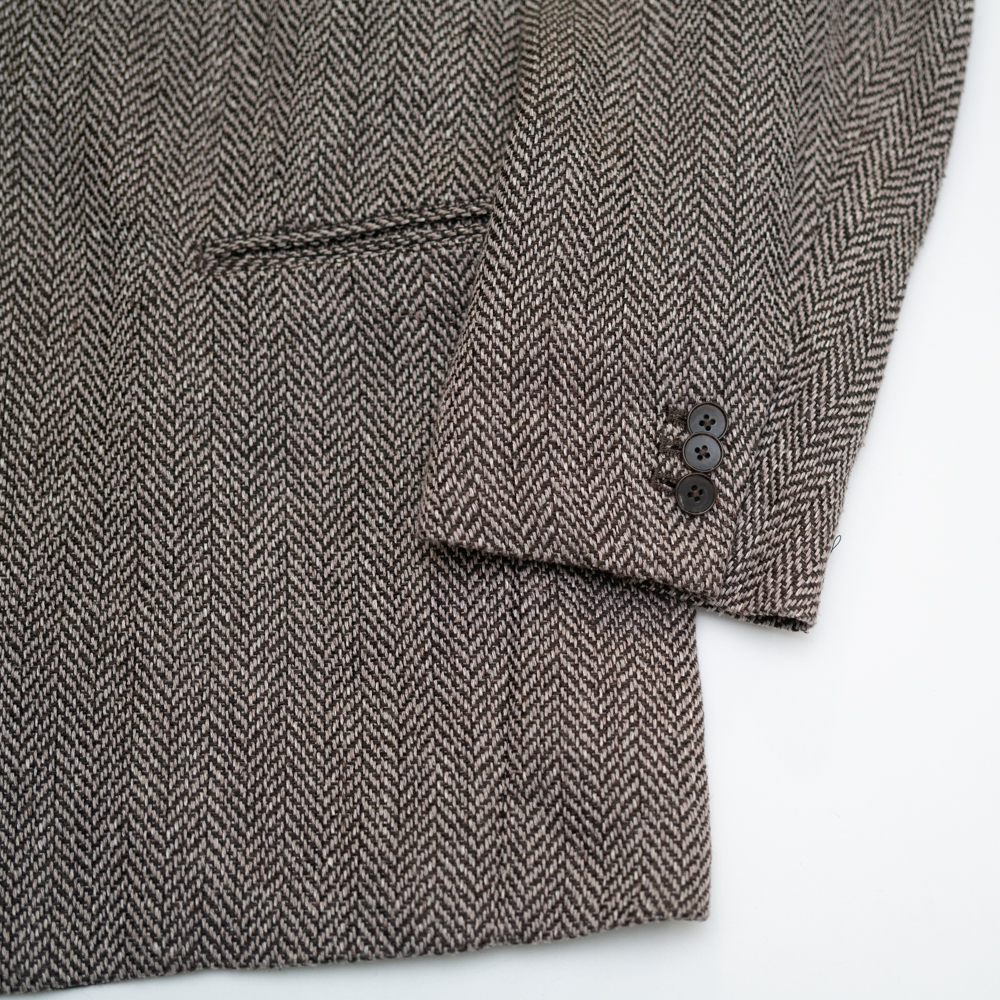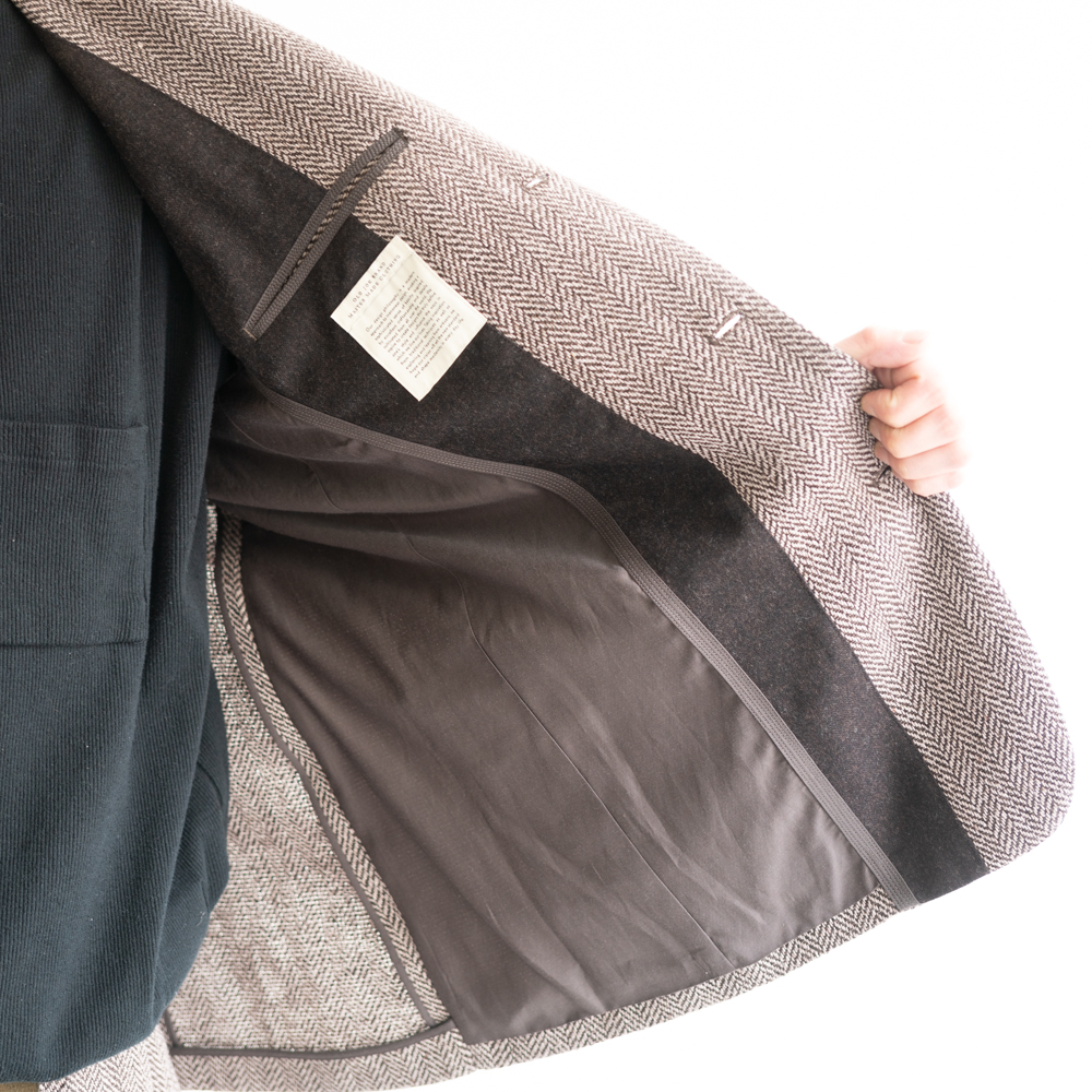 ラペルの返り位置や低めのゴージライン、アームホールに配されたアクションプリーツ、フラップレスのD型閂付き腰ポケットに、緩やかなアールのついた胸ポケットなど、さりげない仕様の中にクラシカルな要素が見え隠れします。
