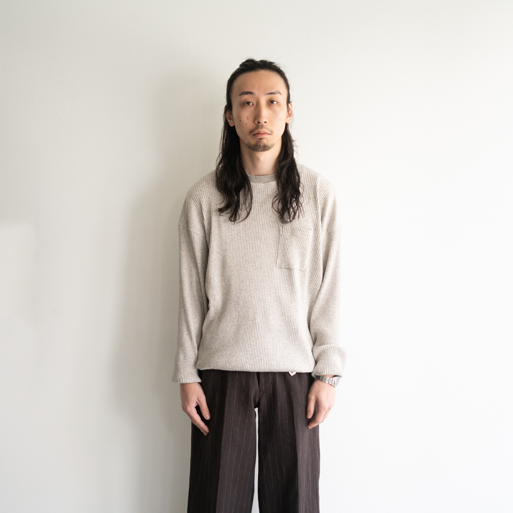 古き良き時代のアンダーウェアのカッティングライン、オリジナルで編み立てたパターンリブ、細部まで現代では珍しい意匠が盛り込まれた一枚。