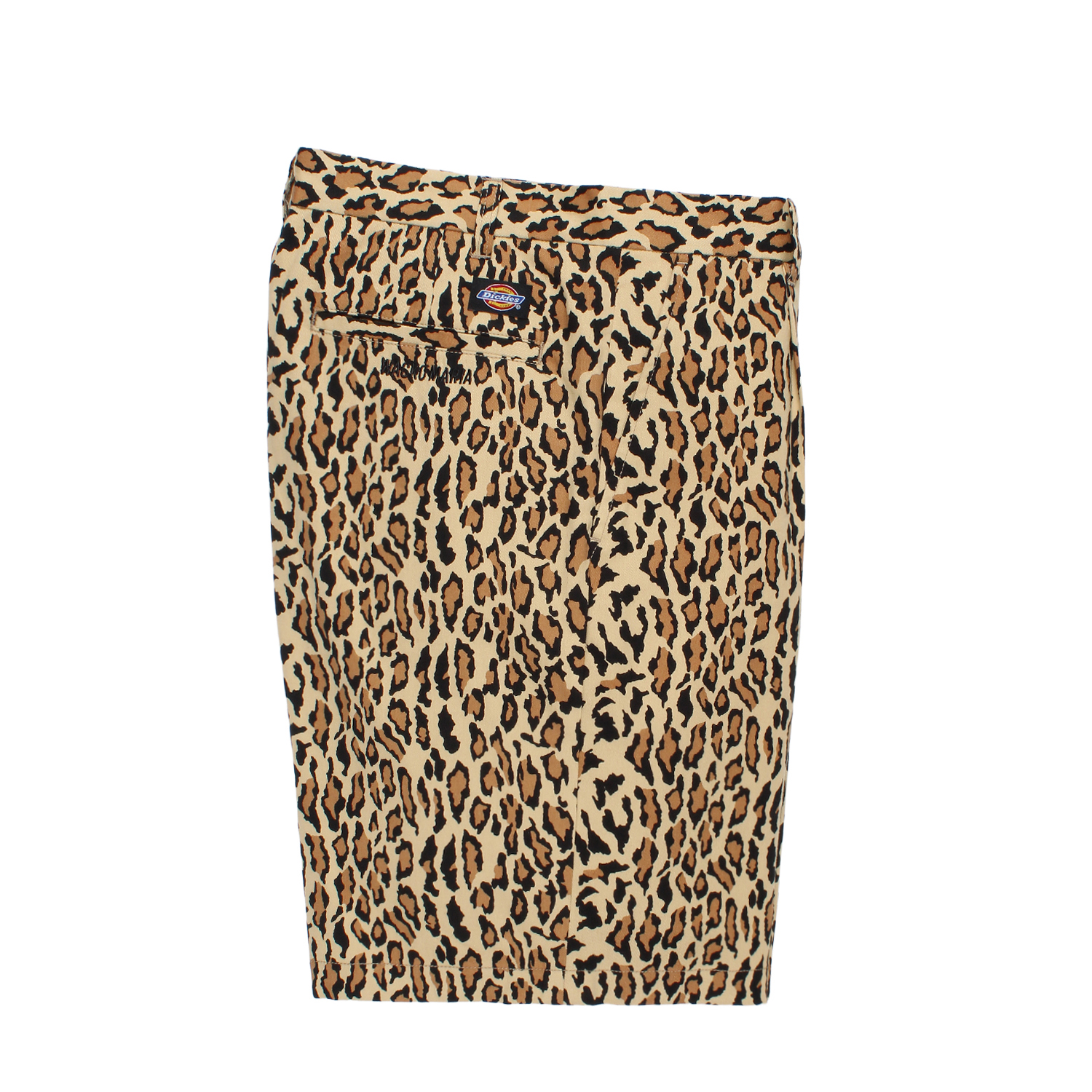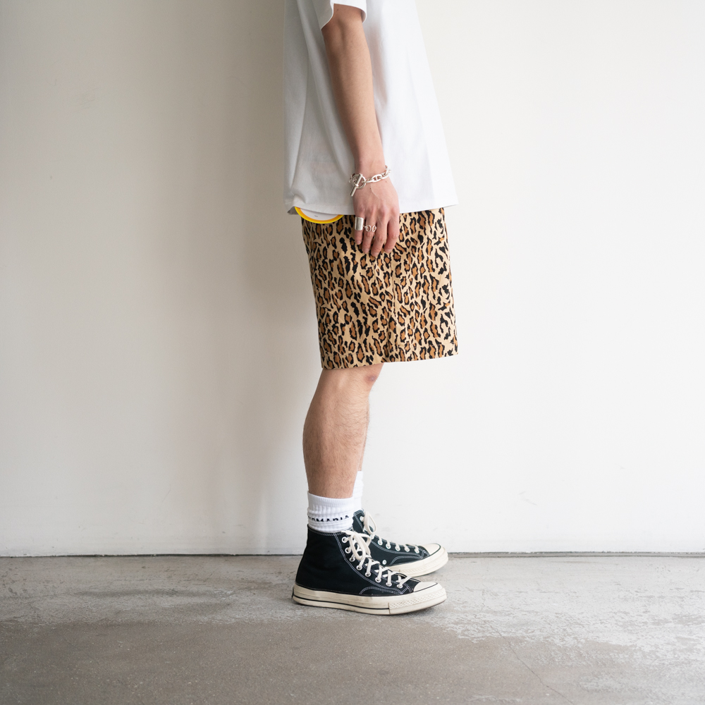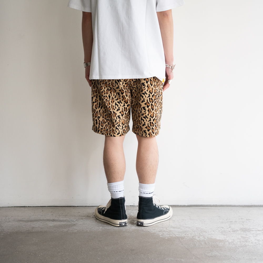 DICKIESのハードなコットンチノにWACKO MARIAオリジナルのレオパードをプリントした、ワンタックプリーツのワイドなショートパンツ。