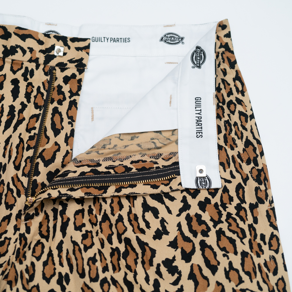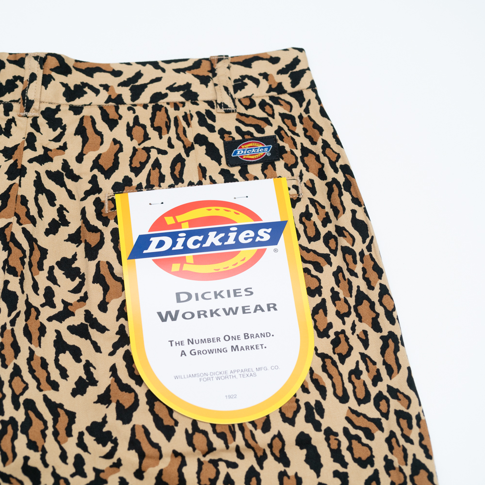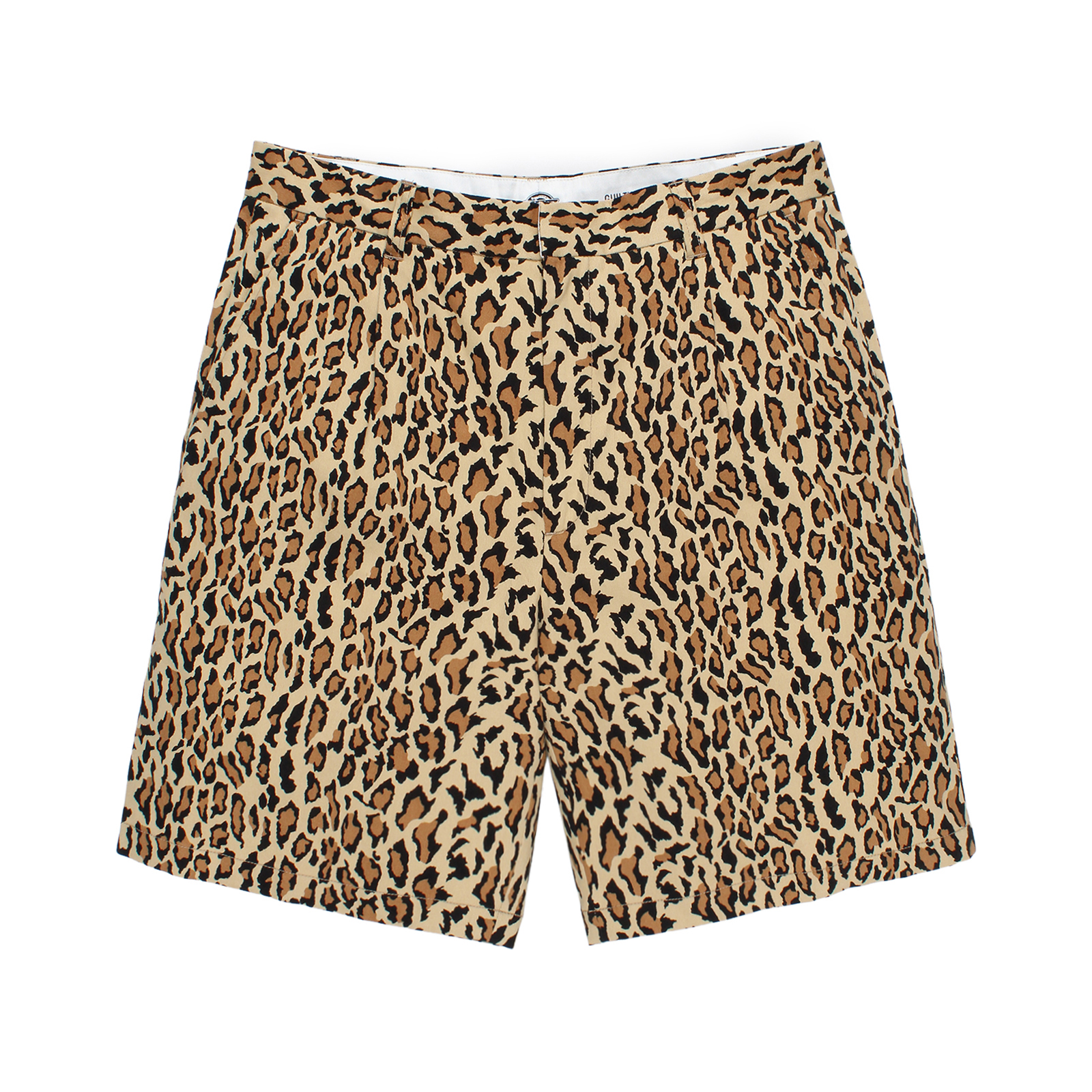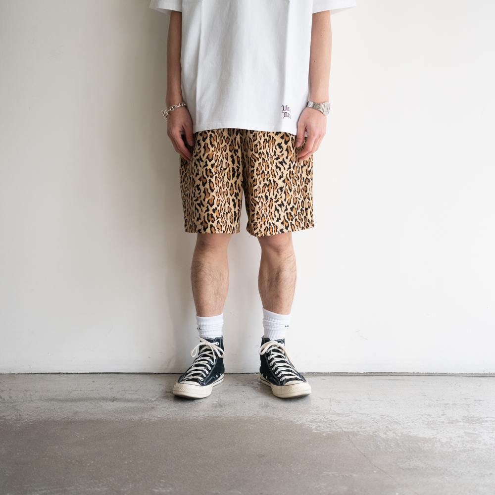 DICKIESのハードなコットンチノにWACKO MARIAオリジナルのレオパードをプリントした、ワンタックプリーツのワイドなショートパンツ。