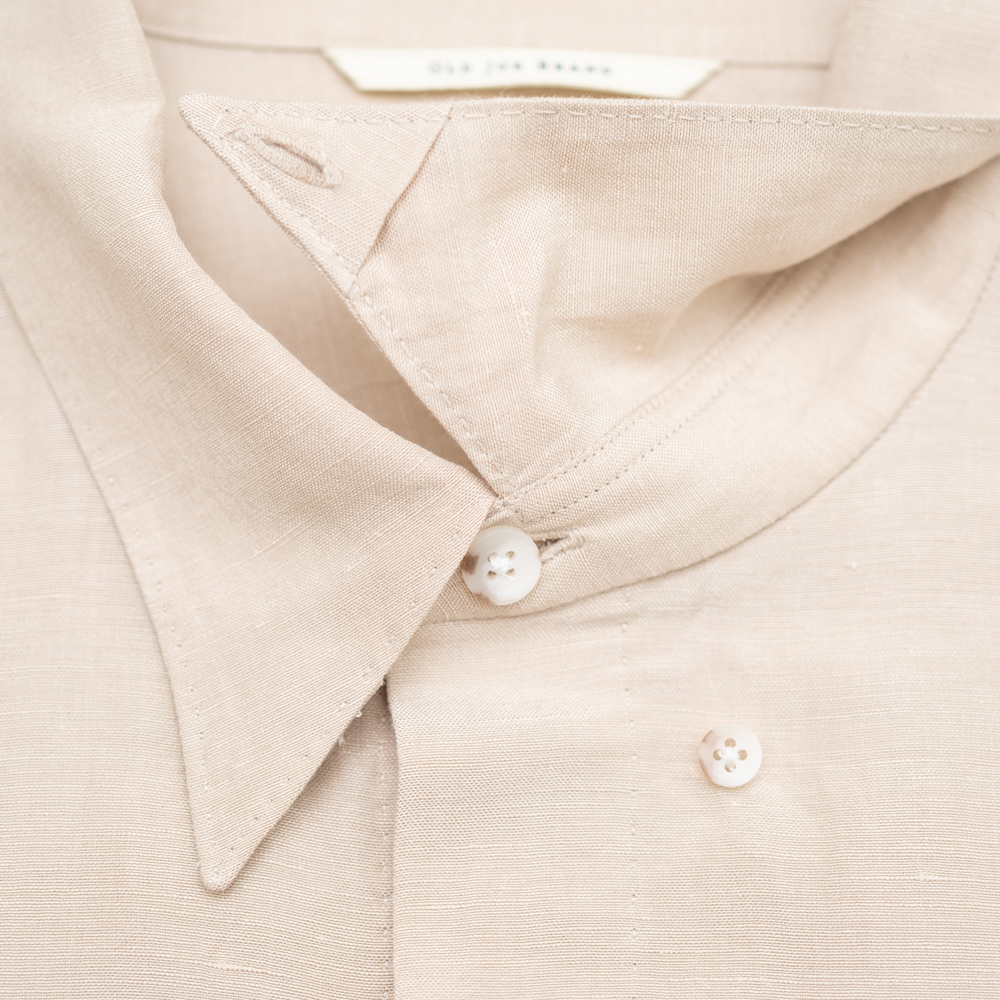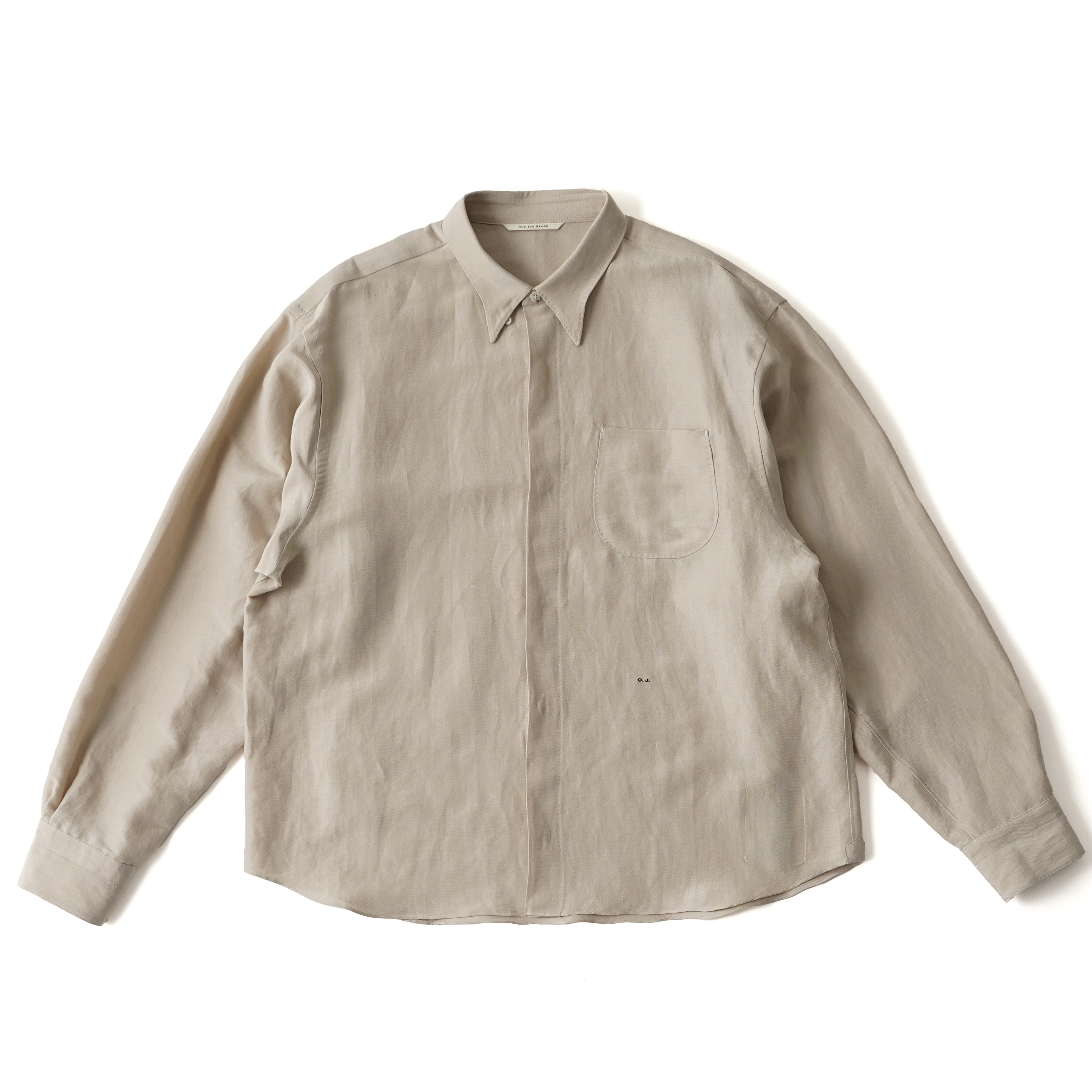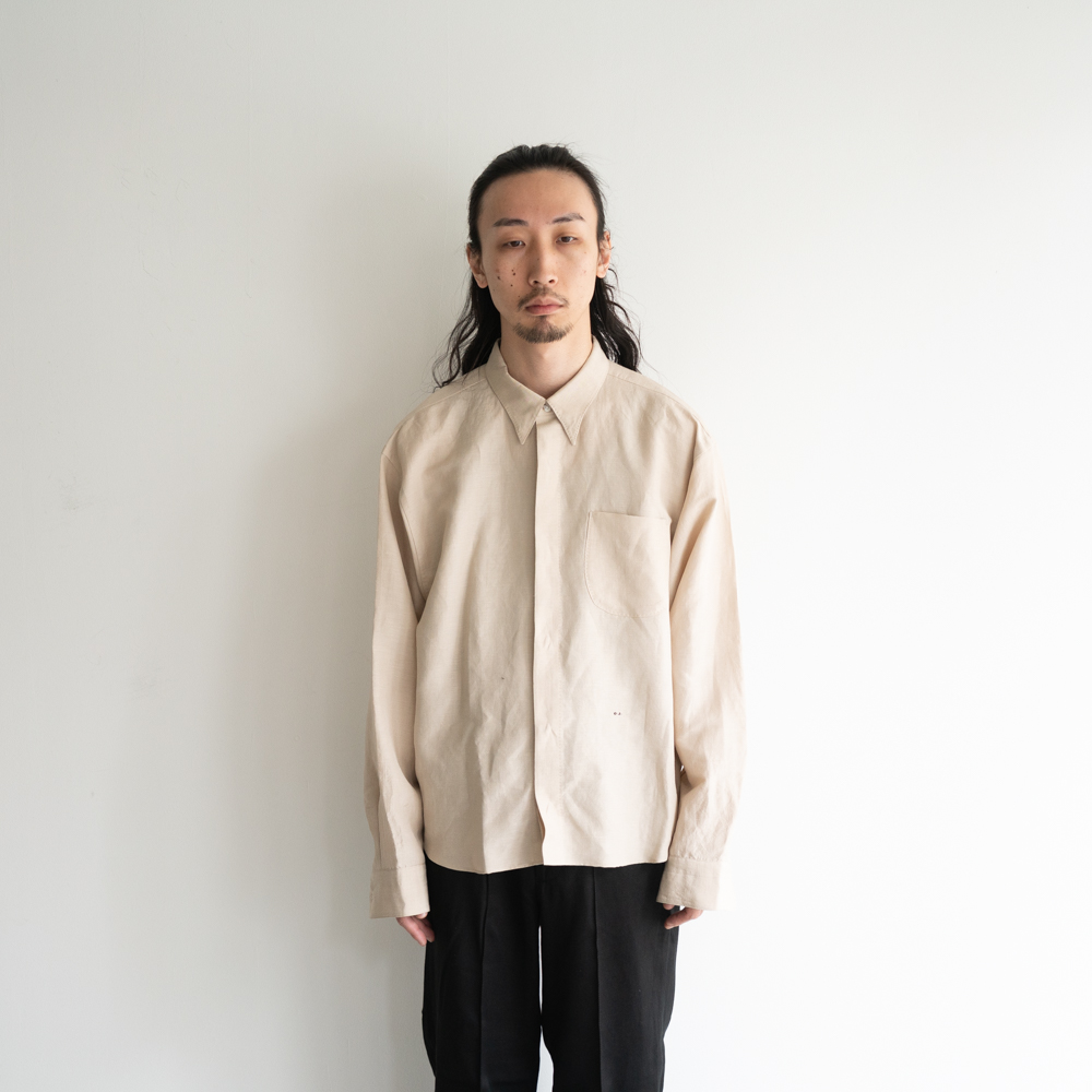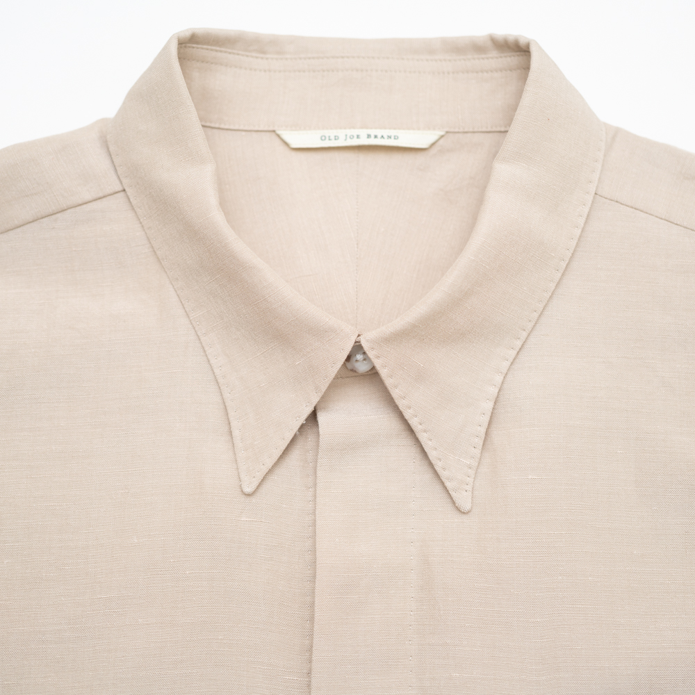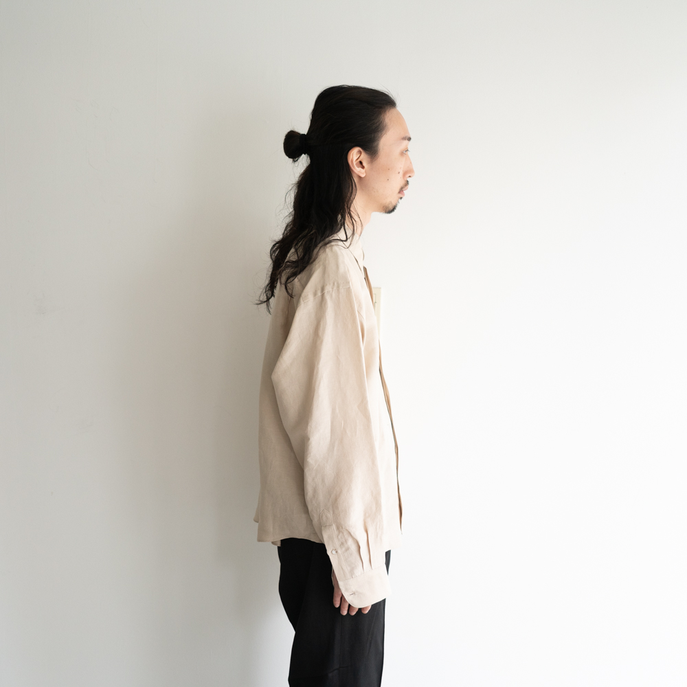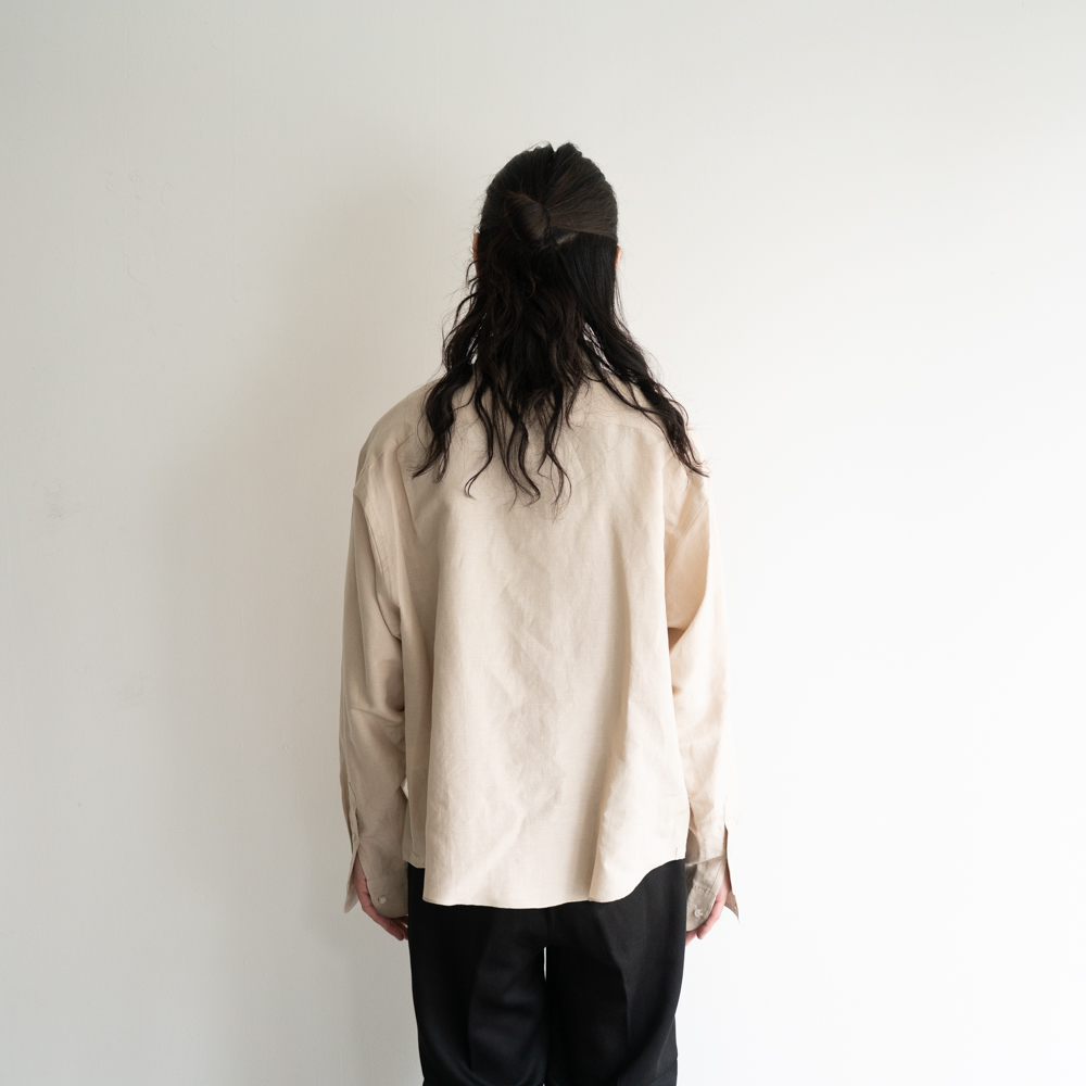 フライフロント、ヒドゥンボタンカラー、中縫いで仕立てたポケット、規則正しく並んだAMFステッチ等、クラシカルなドレスシャツのディテールと、ショートレングスでアームホールを大きく設計したデザインが特徴です。