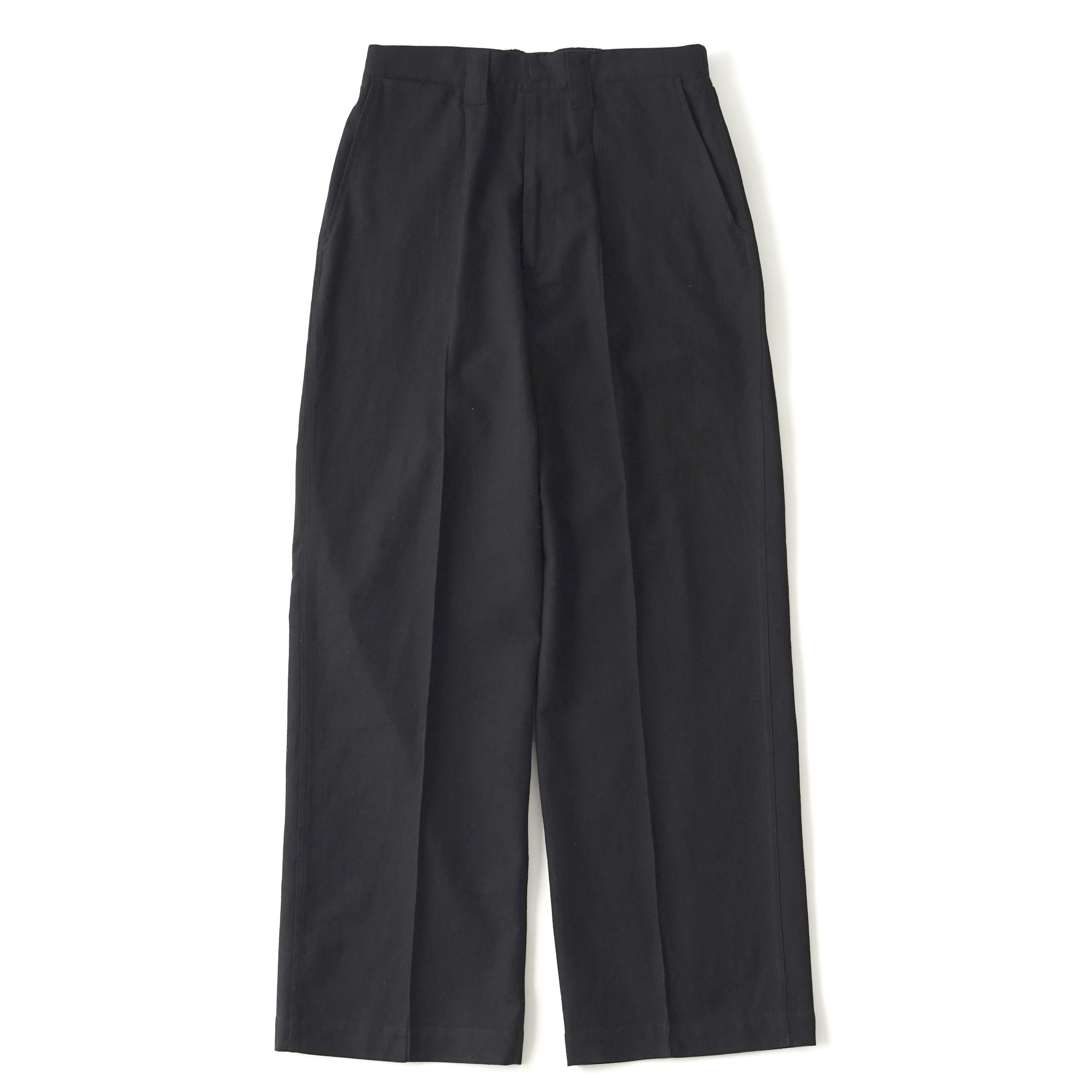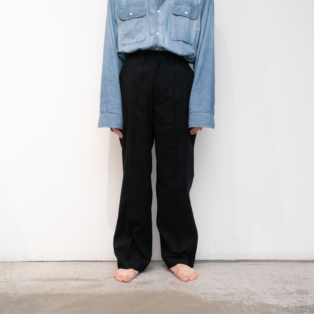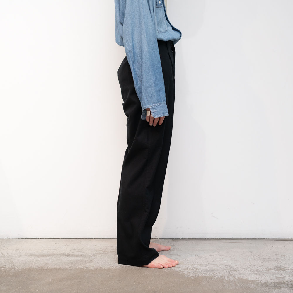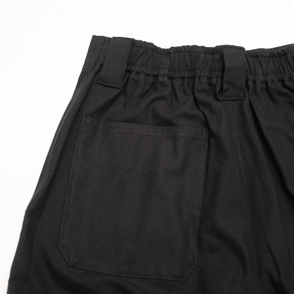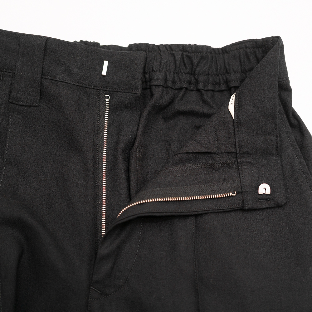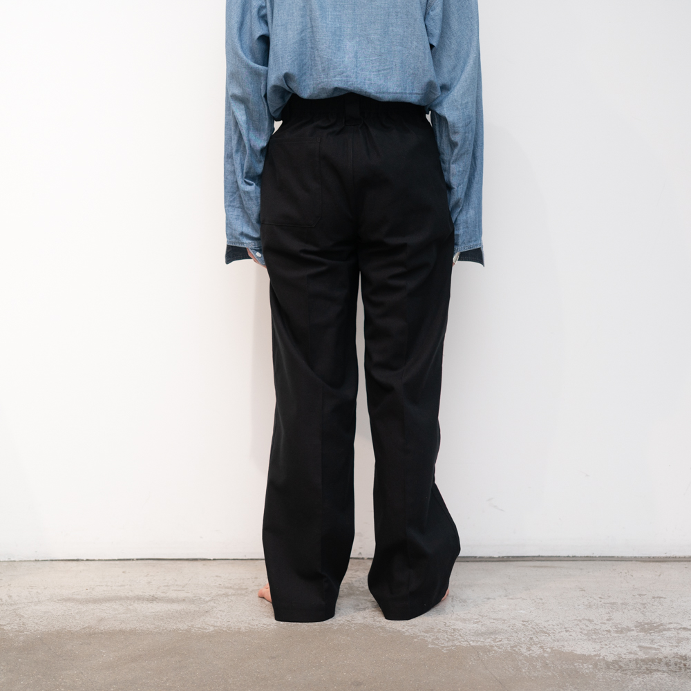 後身頃がギャザードウエスト、前身頃はプリーツとクリースラインが配してあるのでカジュアルになりすぎずない。
