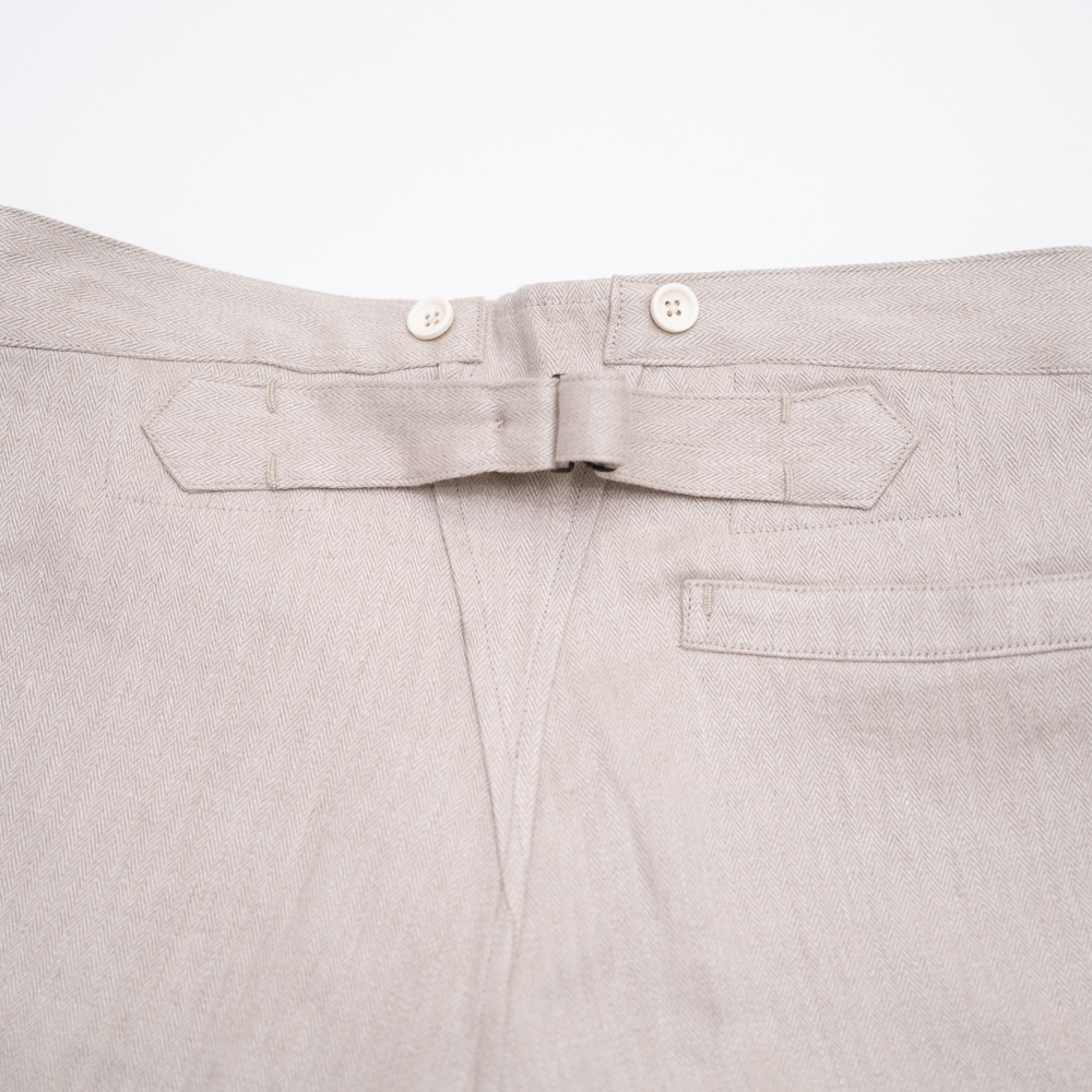 サスペンダーボタン、ウエストバンド上のウェルトポケット、ベルトレスジャストフィットさせるシンチバック。