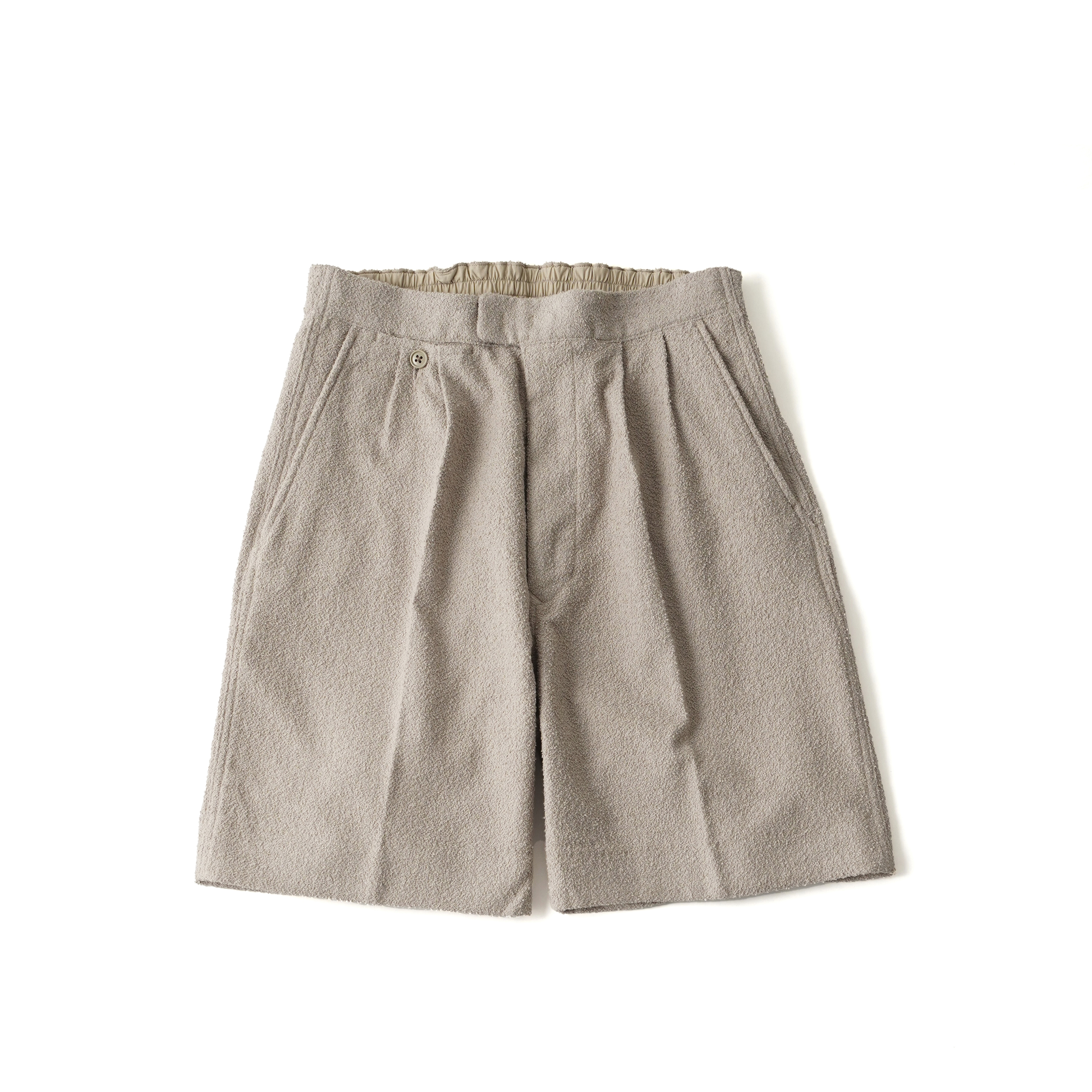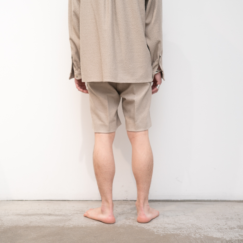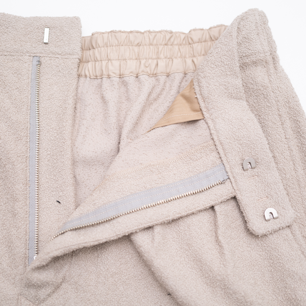 前見頃はプリーツとクリースラインが配してあるのでカジュアルになりすぎず、ベルトレスなのでタックインの際も美しい佇まい。