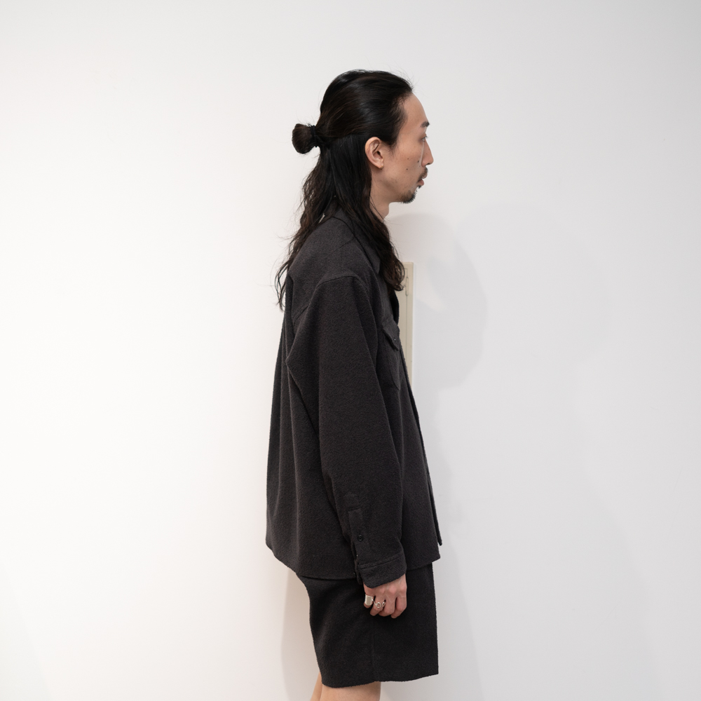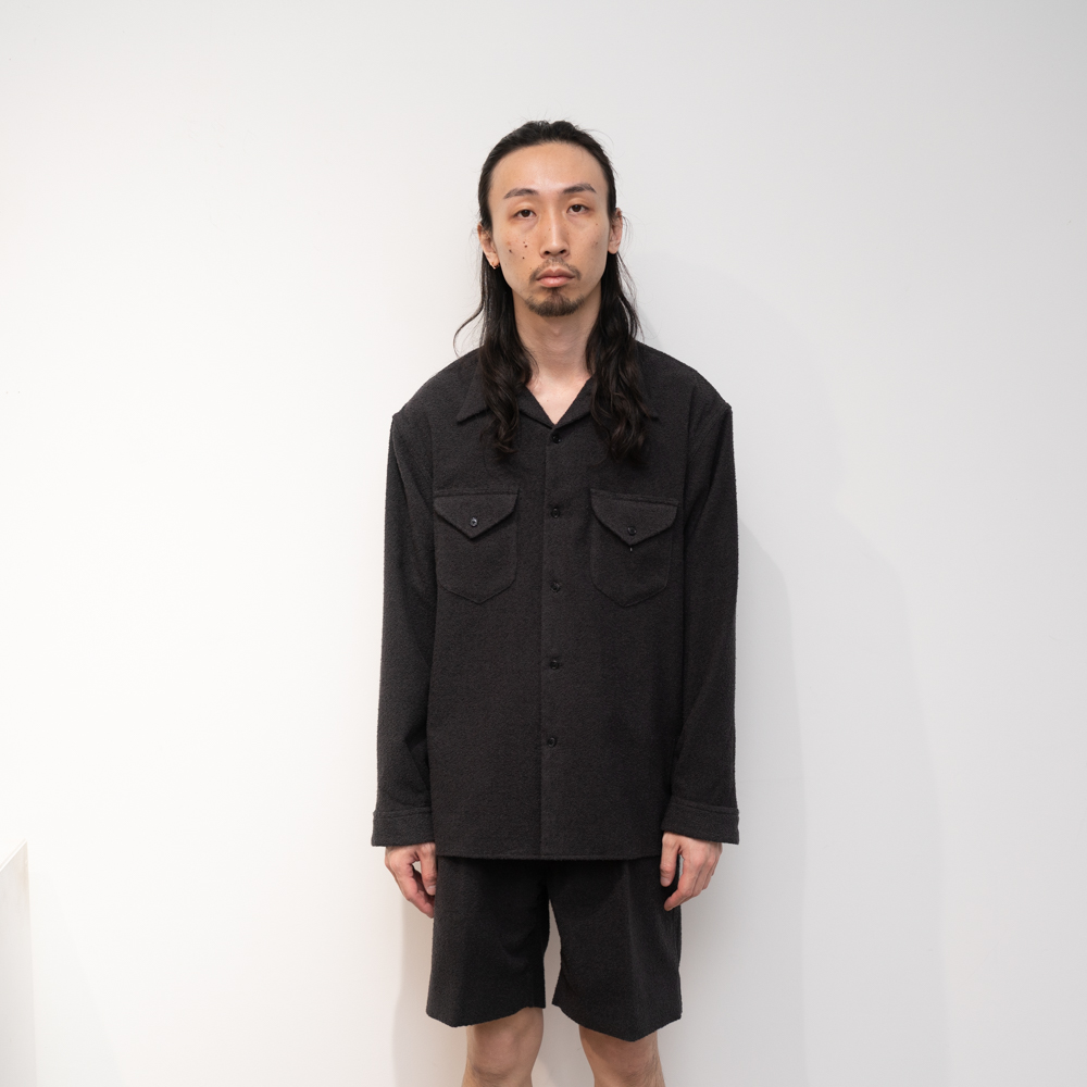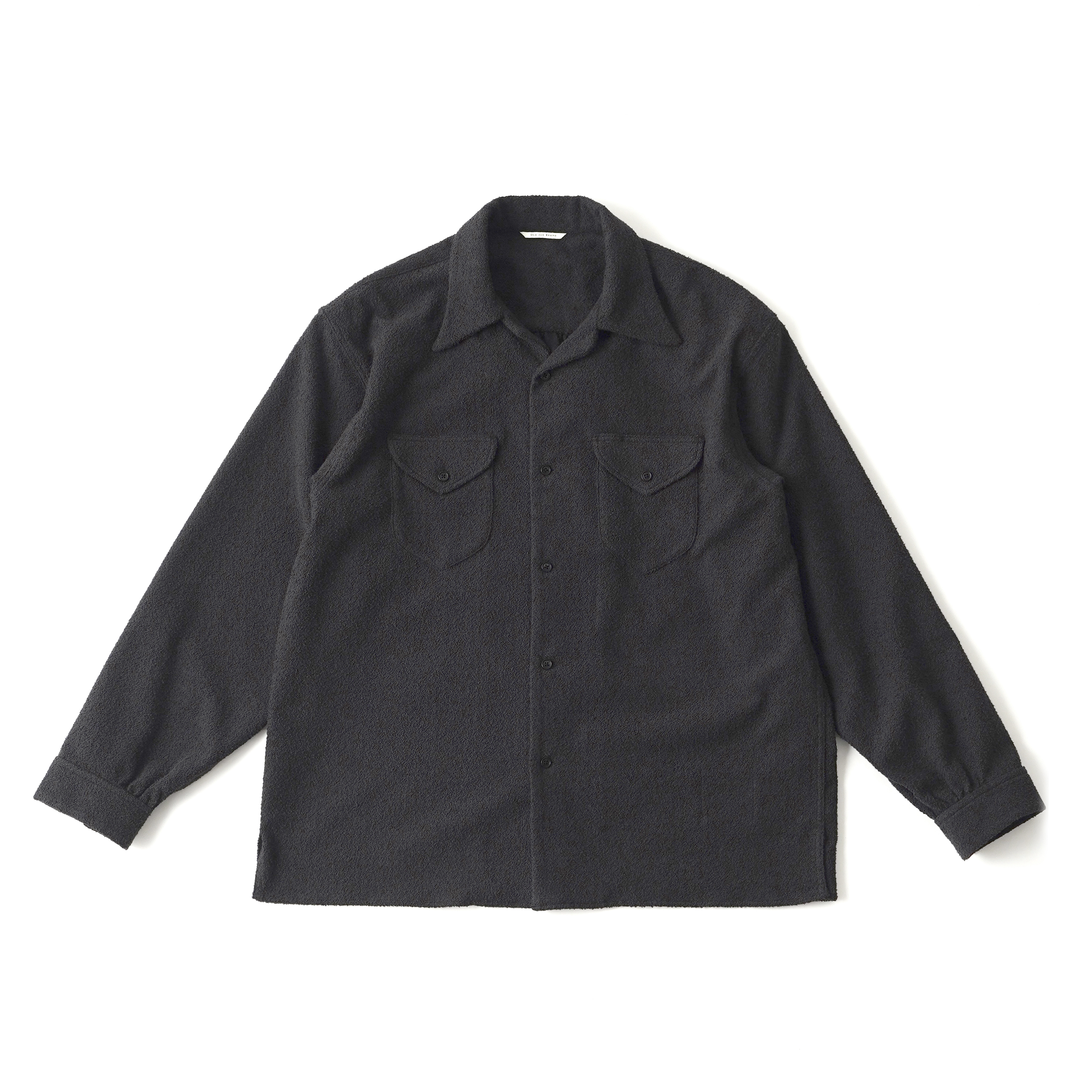 1940sのスポーツシャツをイメージしてデザインされたフロントのダブルポケット、ゆったりとした身幅のバランスに、オリジナル染色したパイルクロスで制作。