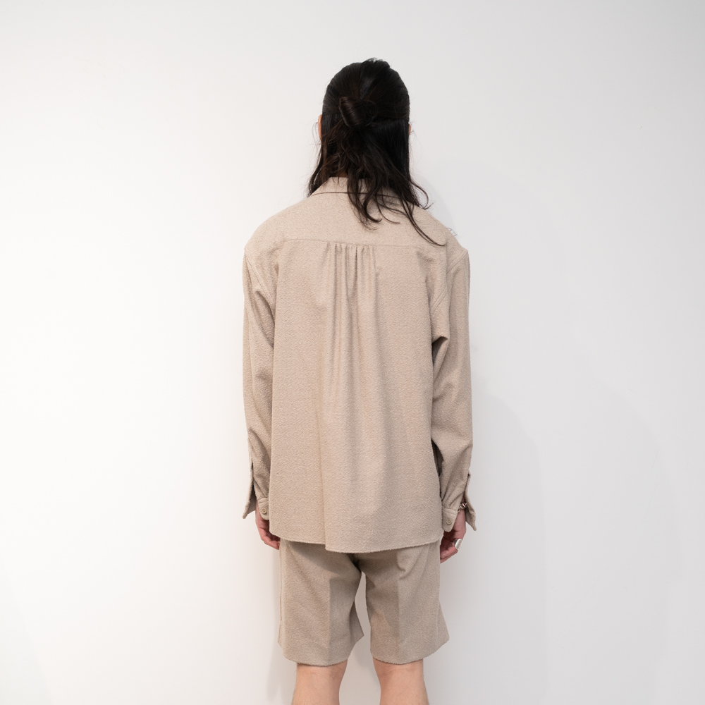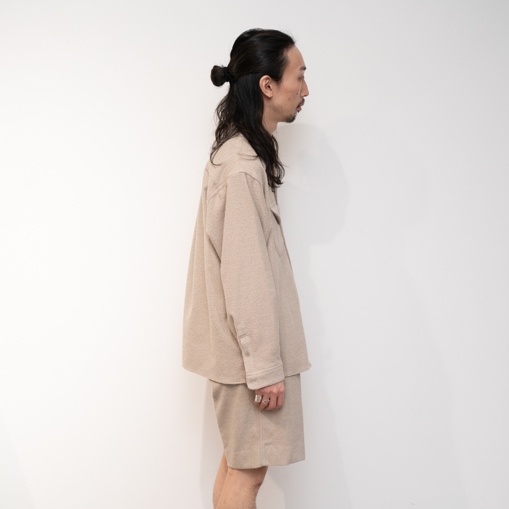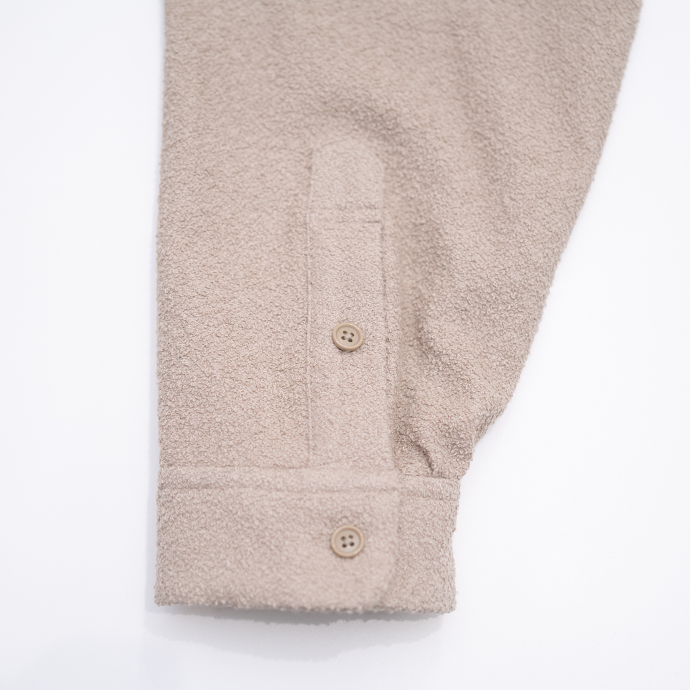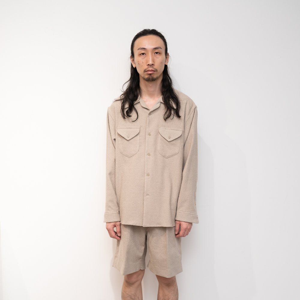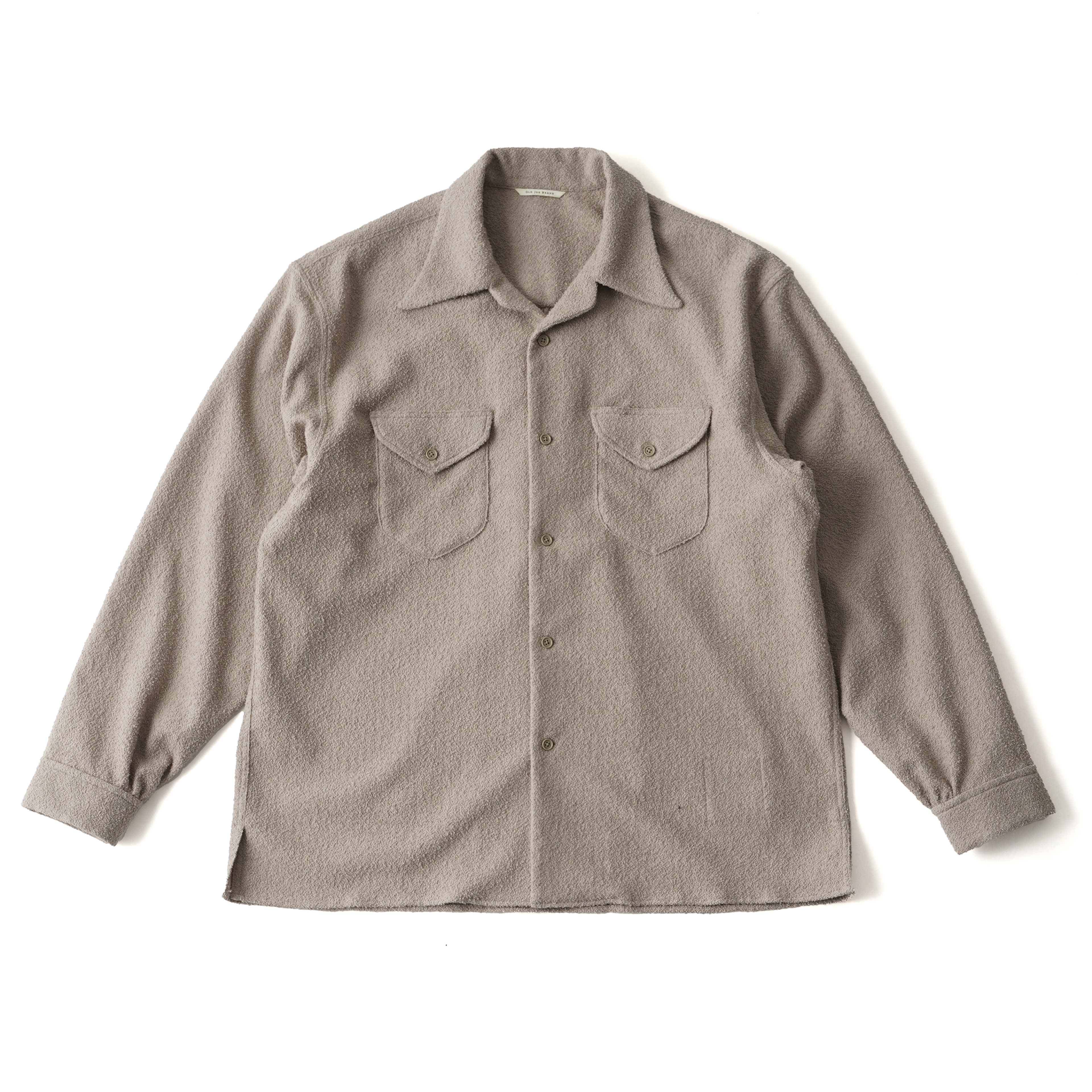 1940sのスポーツシャツをイメージしてデザインされたフロントのダブルポケット、ゆったりとした身幅のバランスに、オリジナル染色したパイルクロスで制作。
