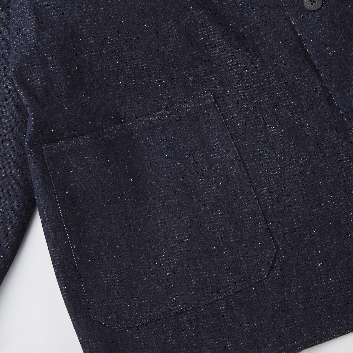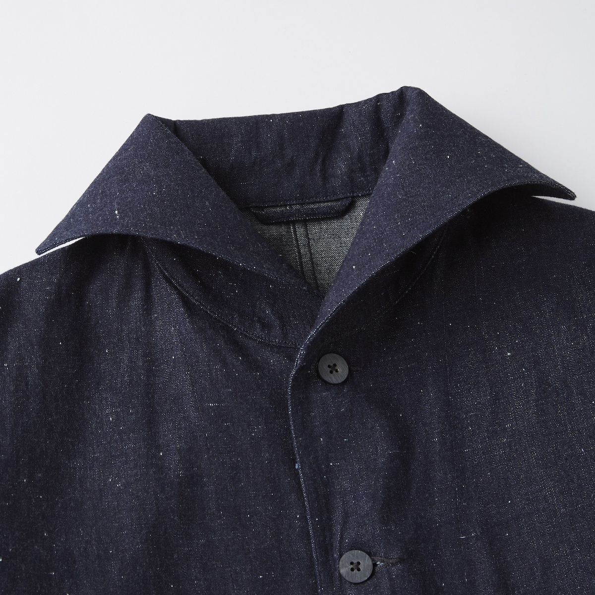 糸に拘り、オリジナルのデシネップを使用しています、 タテ糸は、デニム本来の素朴さやドライ感、バルキー感を表現するために繊維長の短めの綿も混ぜ込んで糸をつくりました。ヨコ糸は、米綿をメインにオーストラリア、ブラジル綿とブレンドし、安定した質感を目指し、また追燃することにより柔らかさの中にシャリ感をだしています。ロープ染色は黒味の強いインディゴ染料で染色し、深い色目を表現しています。 生地はいわゆるキバタと言われる織り上がった状態のものから、特殊な方法でサンフォライズ(防縮加工)のみをかけています。キバタの風合いを損なわず、表面の毛羽感も残しました。
