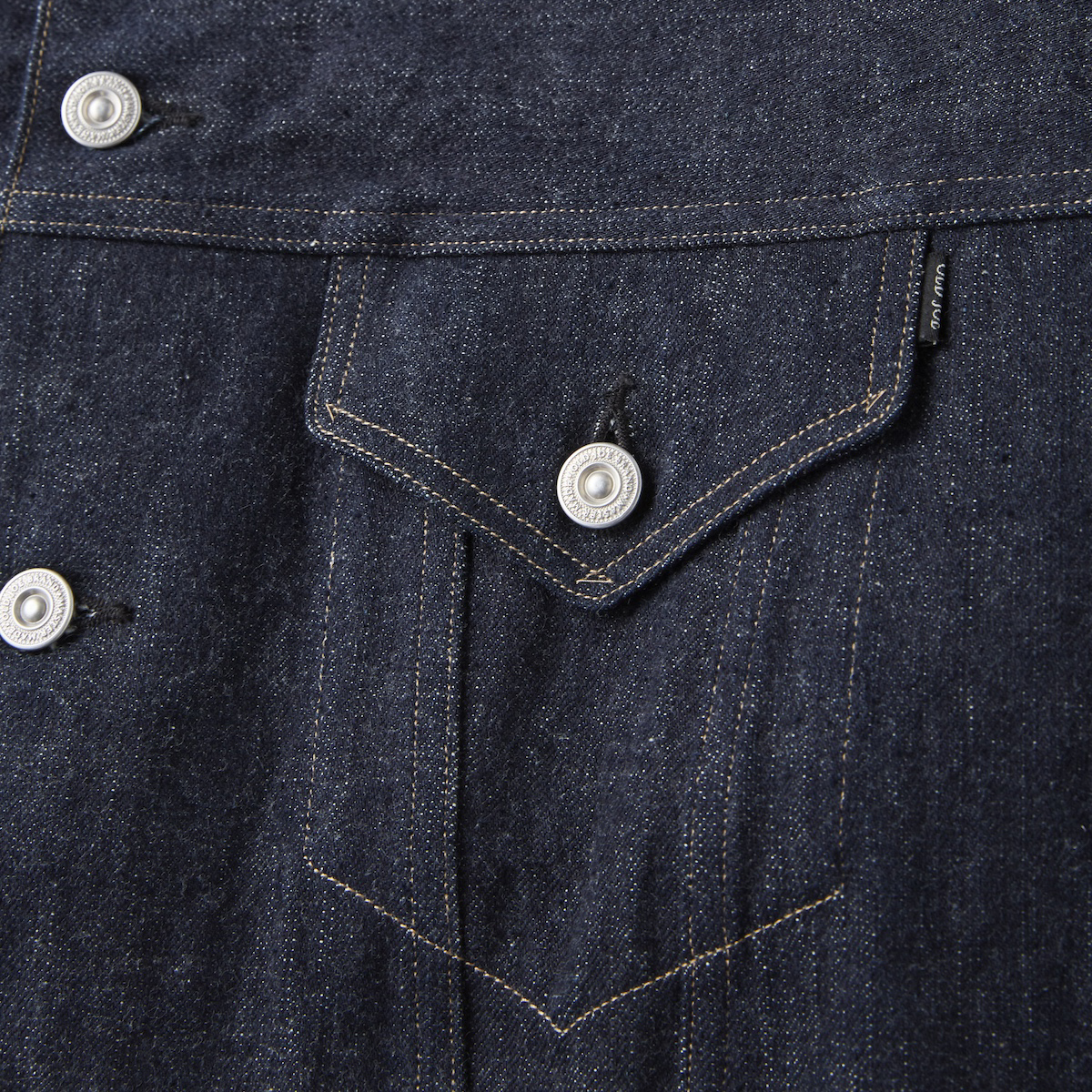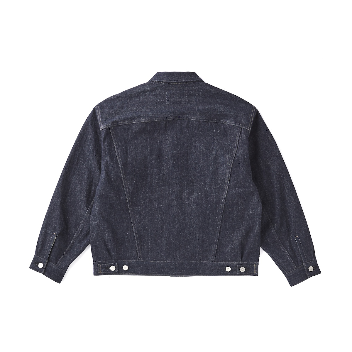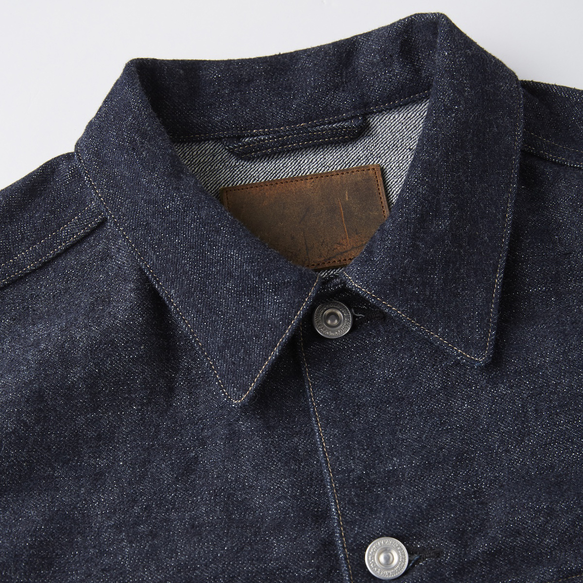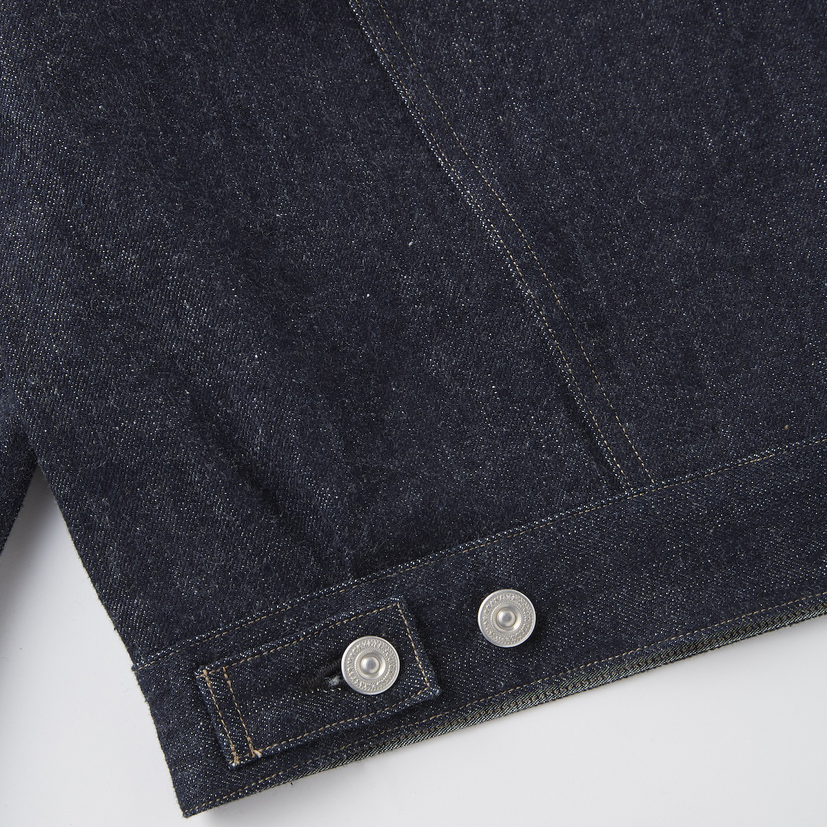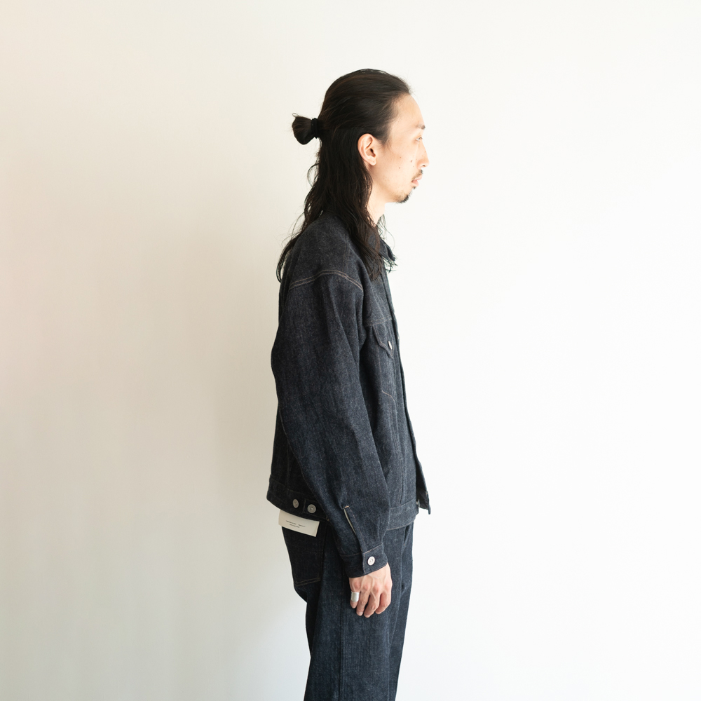 生地はいわゆるキバタと言われる織り上がった状態のものから、特殊な方法でサンフォライズ(防縮加工)のみをかけています。 通常の防縮方法とは違いますのでいわゆるリジッドデニムと呼ばれる表面にノリが付着した固い生地にはならず柔らかな手触りを表現しました。