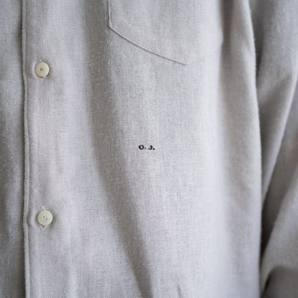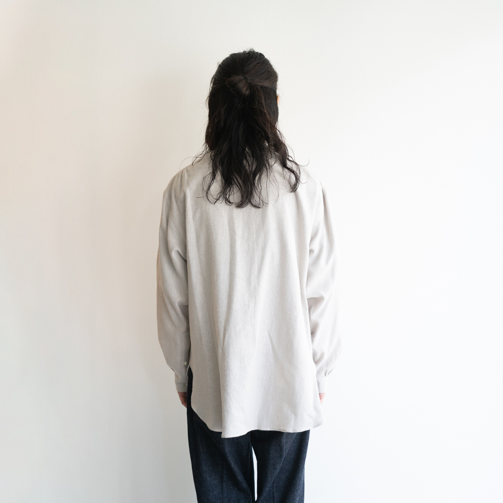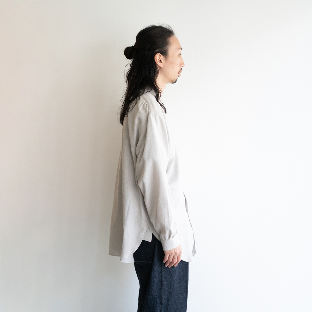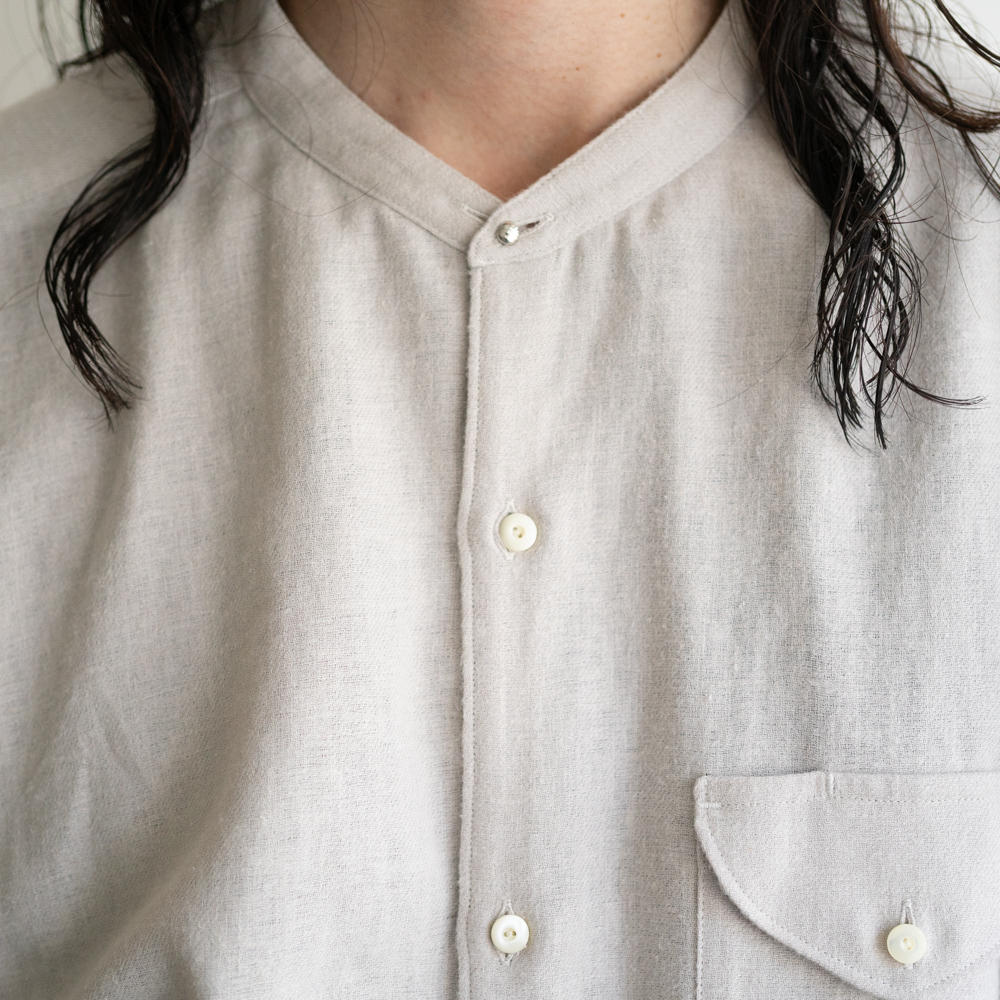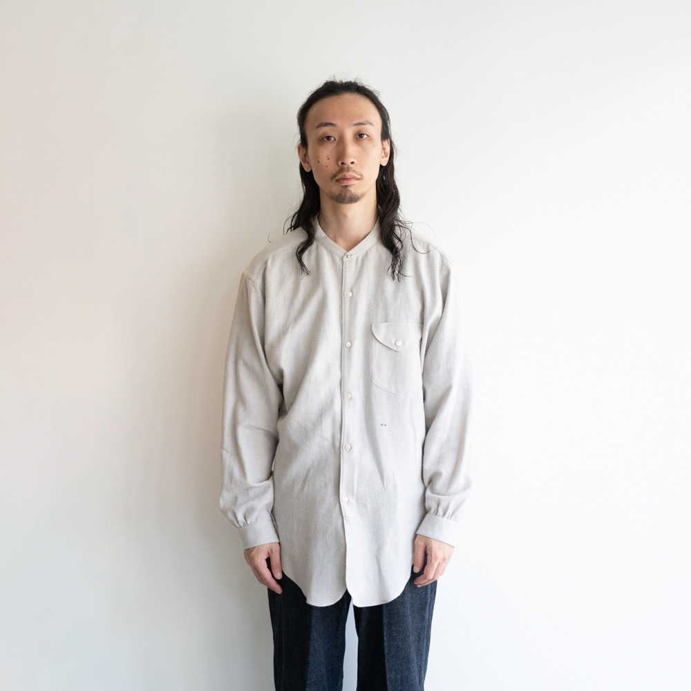 型から起こしたウッドのスタッドボタンと長めのレングスが目を引く、OLD JOE (オールドジョー)のバンドカラーシャツ。