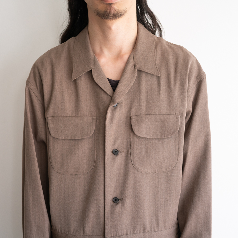 夏の装いに必要不可欠な開襟シャツとスラックスをドッキングさせたかのようなデザインが目を引きます。