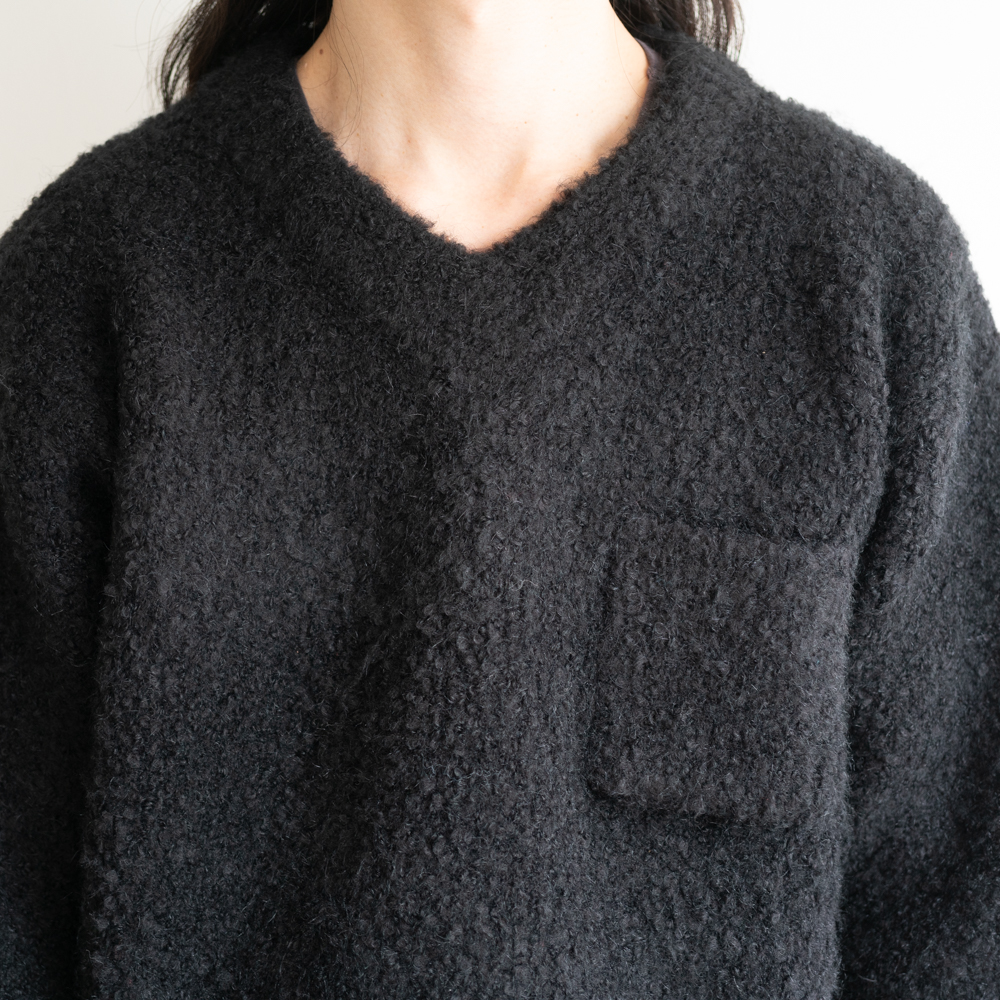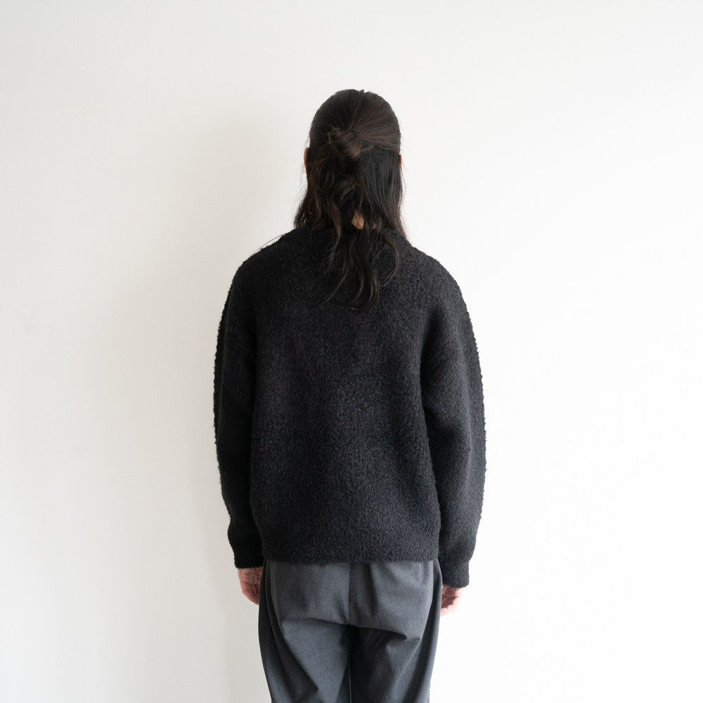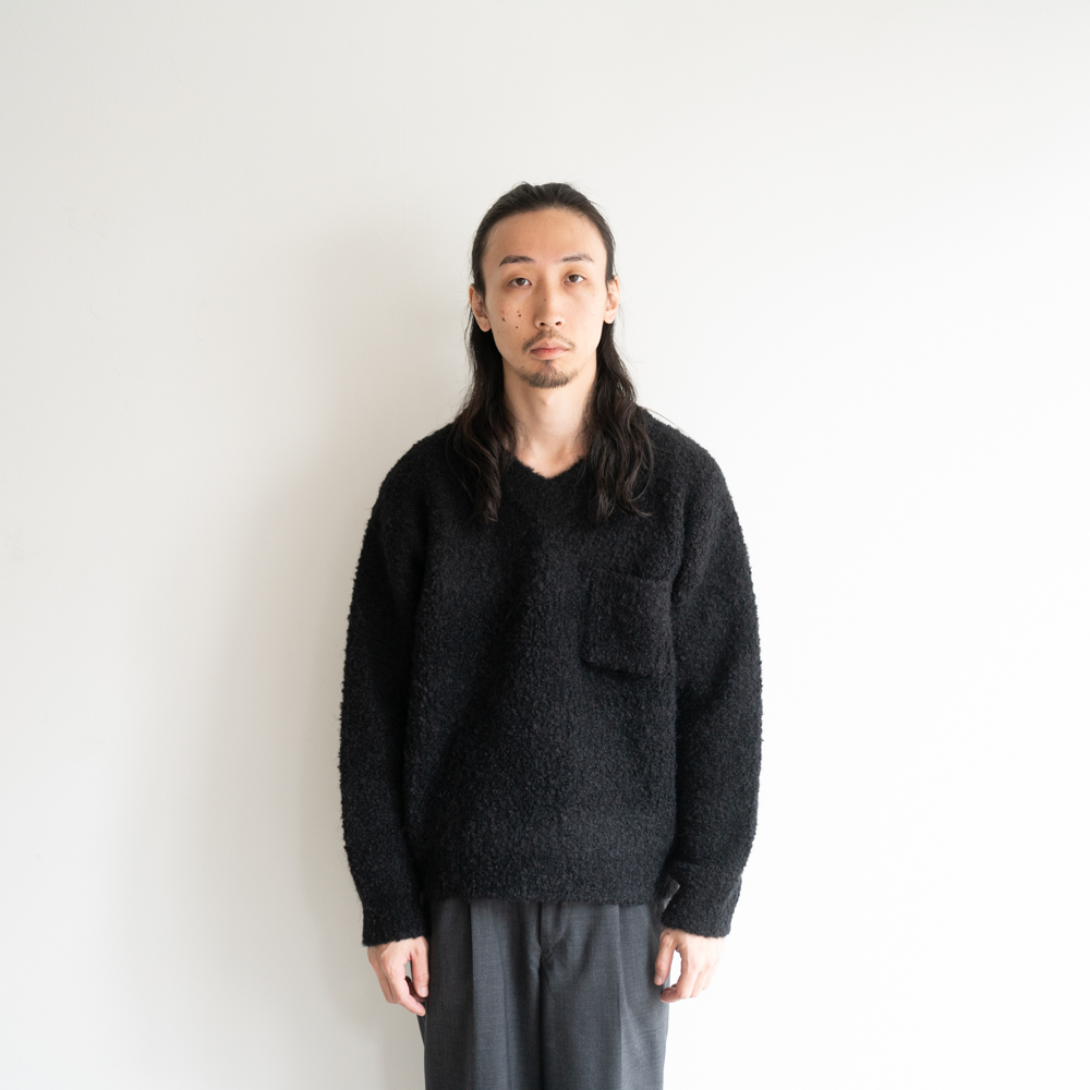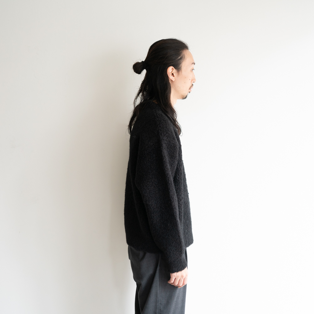アルパカ70%以上の糸とビックループが印象的なファンシーヤーンを片畦裏使いの引き揃えで3Gで編み上げた。ファンシーヤーンはカラーネップのような色の変化もありより深みのある印象に。軽い印象ながら地厚でしっかりとしたシルエットが特徴。