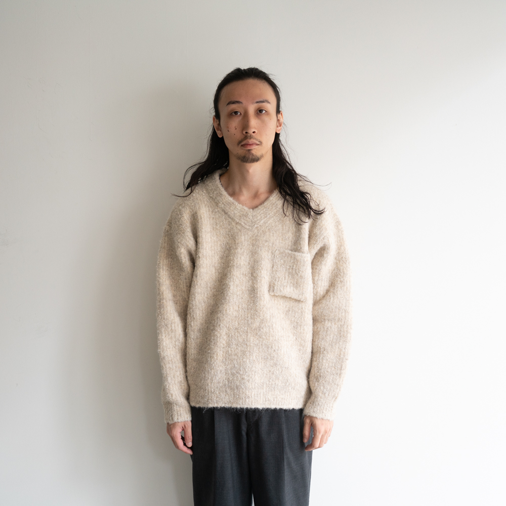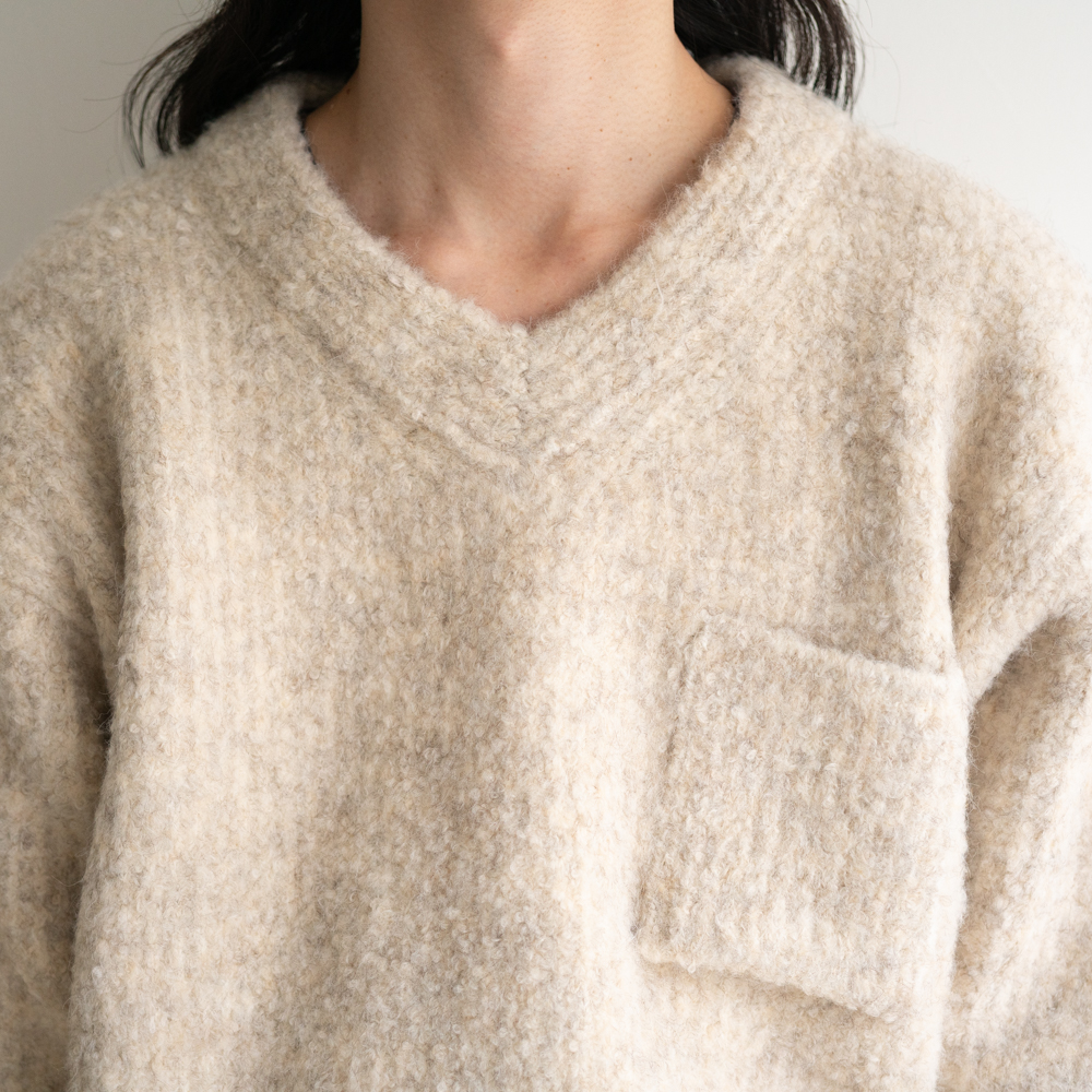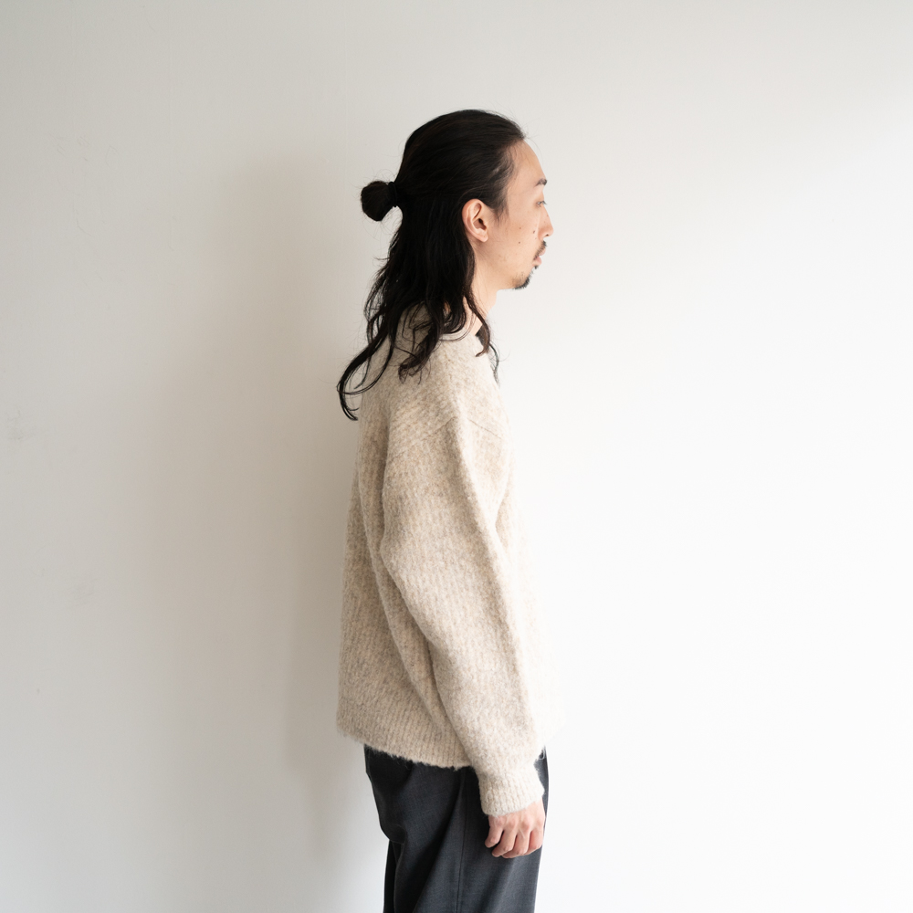 アルパカ70%以上の糸とビックループが印象的なファンシーヤーンを片畦裏使いの引き揃えで3Gで編み上げた。ファンシーヤーンはカラーネップのような色の変化もありより深みのある印象に。軽い印象ながら地厚でしっかりとしたシルエットが特徴。