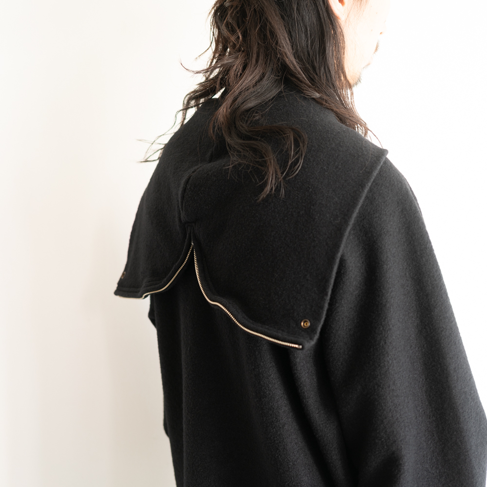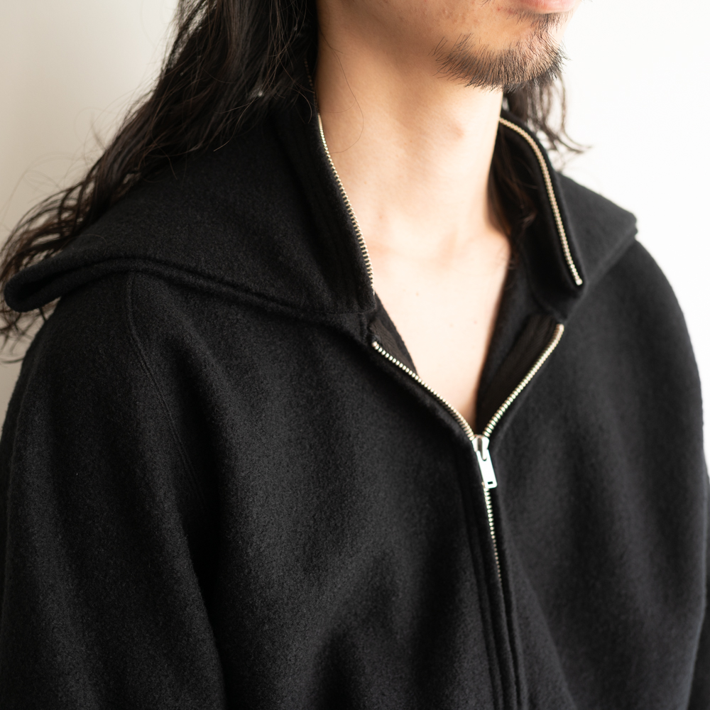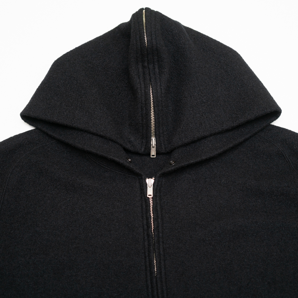 フードに配したジッパーを全開にして折り畳み、襟のようにトランスフォームする事が出来るユニークなデザインが目を引く。