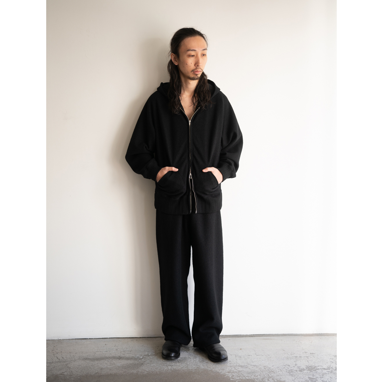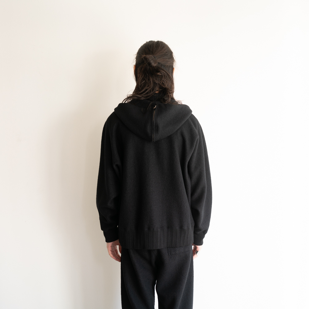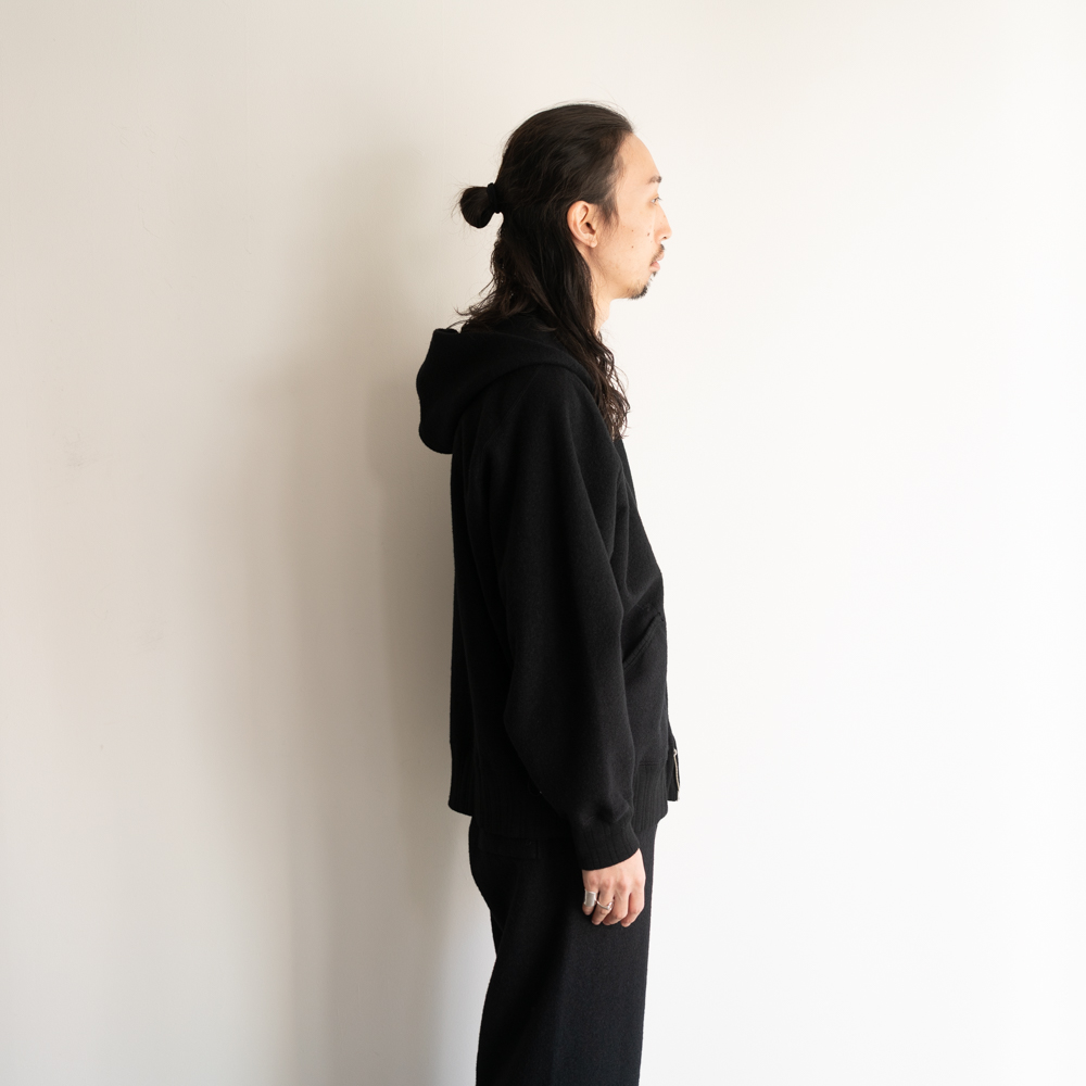 ウールのファンシーヤーンで編み立てたマテリアルは、上質な質感と心地よい肌触りが特徴的。