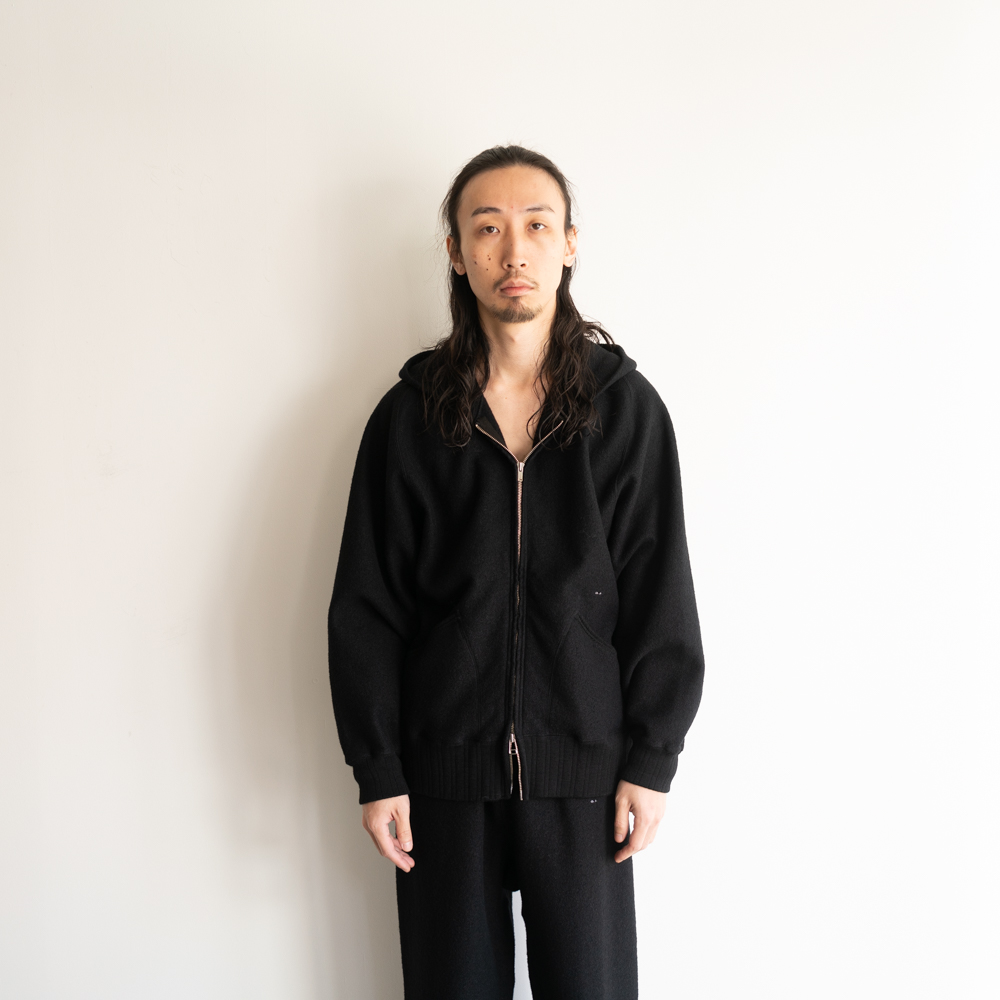 ジッパーフロント仕様のスウェットフーディー。