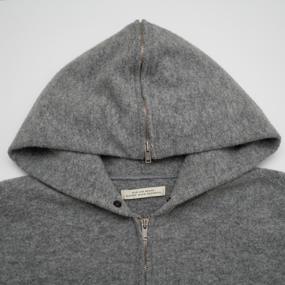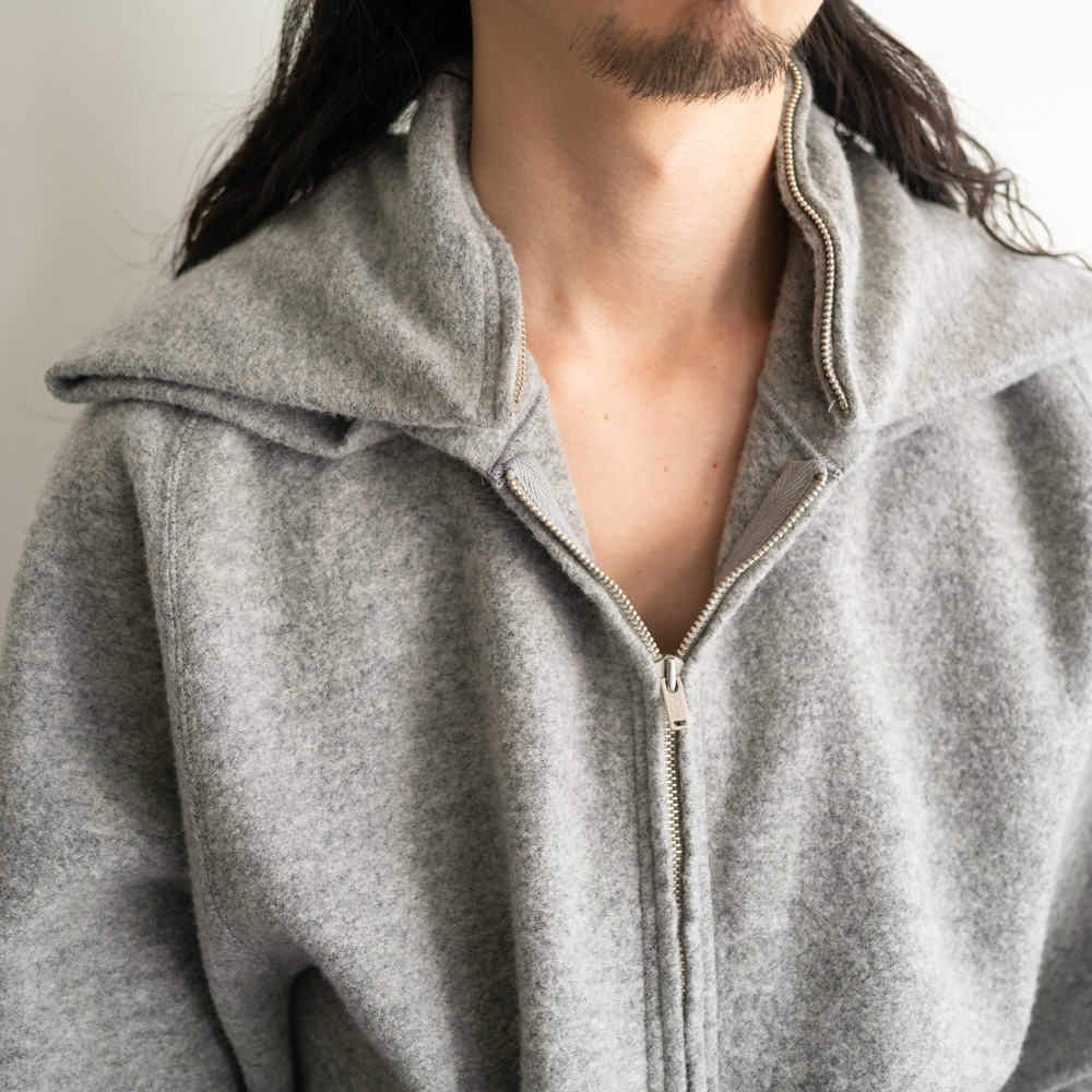 フードに配したジッパーを全開にして折り畳み、襟のようにトランスフォームする事が出来るユニークなデザインが目を引く。