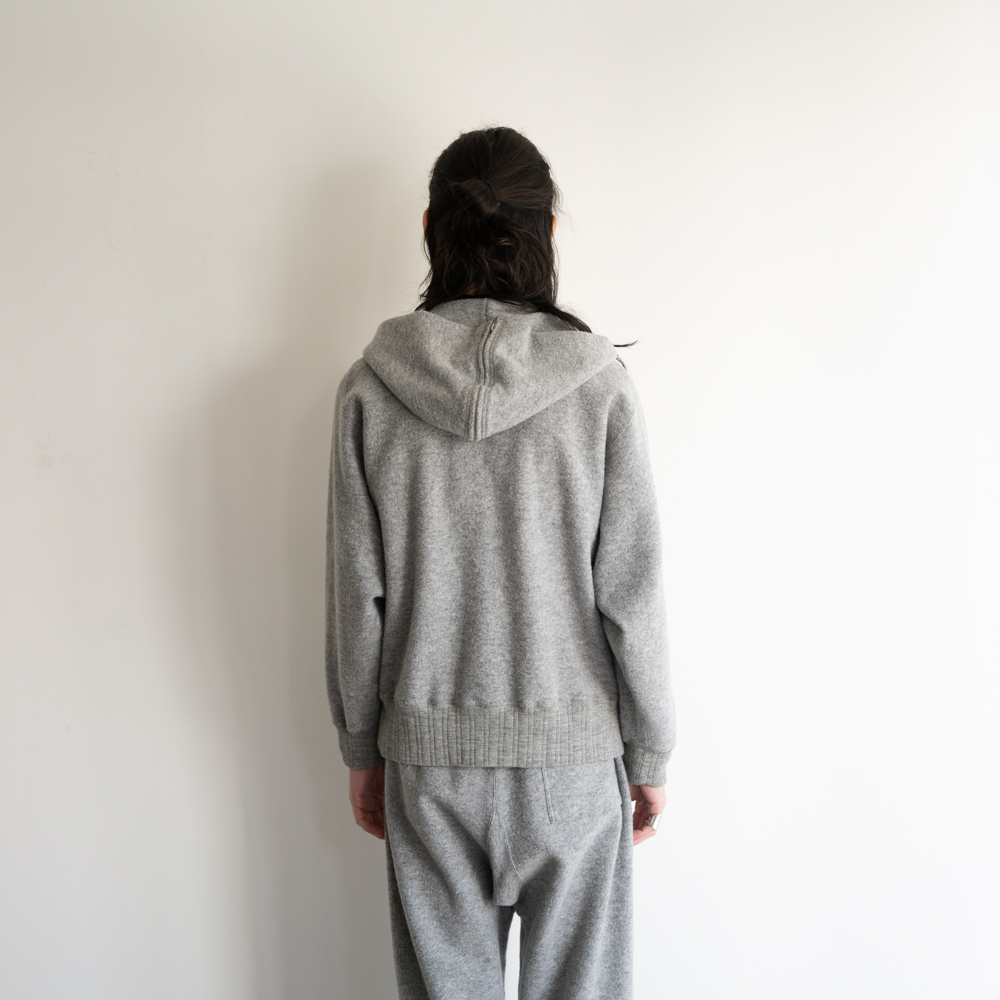 ウール繊維をリング状に整形したファンシーヤーンを使用し、12Gで編み上げたウールリング。リングヤーンならではのふっくらとした表情が魅力。ボリュームのあるリングヤーンで編んだふっくらとした天竺に、フライス加工を施して高密度にすることで、しっかりと厚みのある素材に仕上げた。