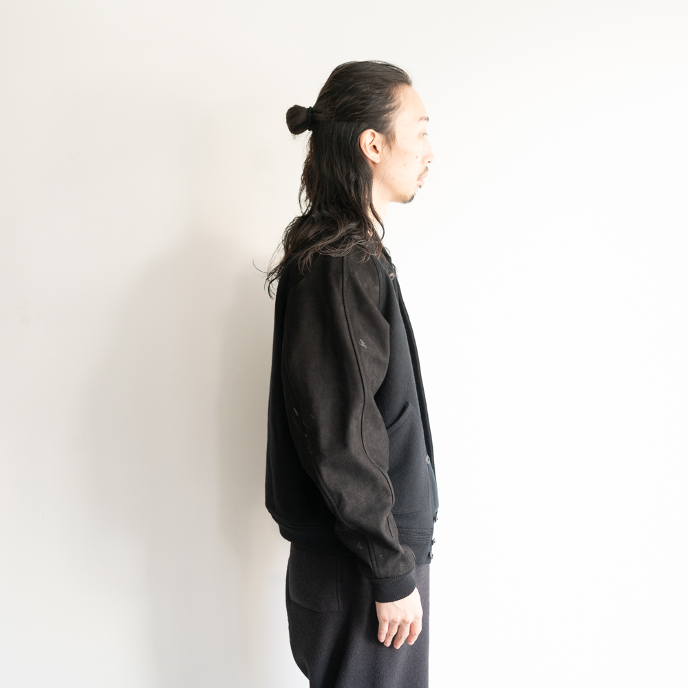 ユニークなラインを見せるラグラン切り替え、2種のウールをブレンドさせて編み立てたブークレーニットパーツ、