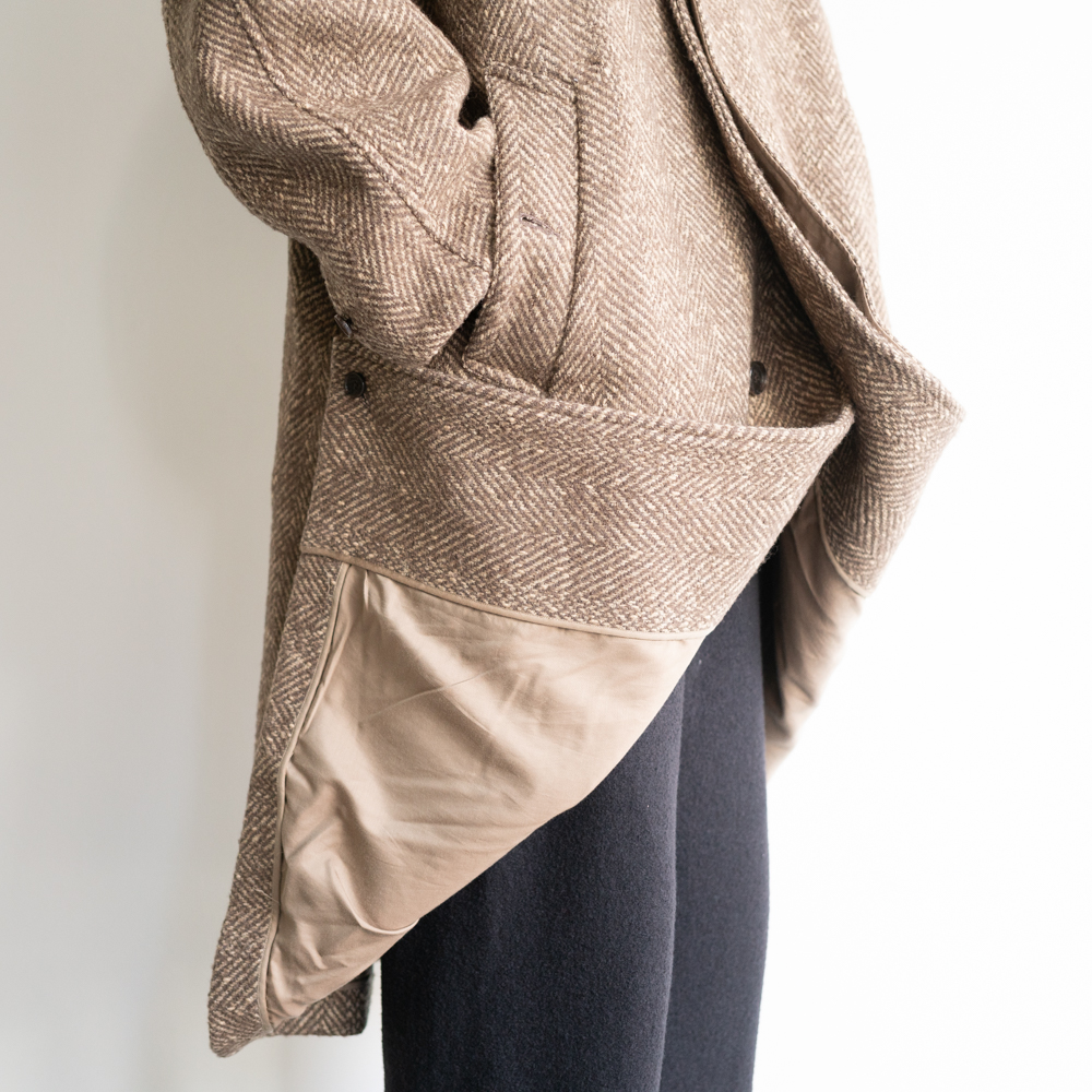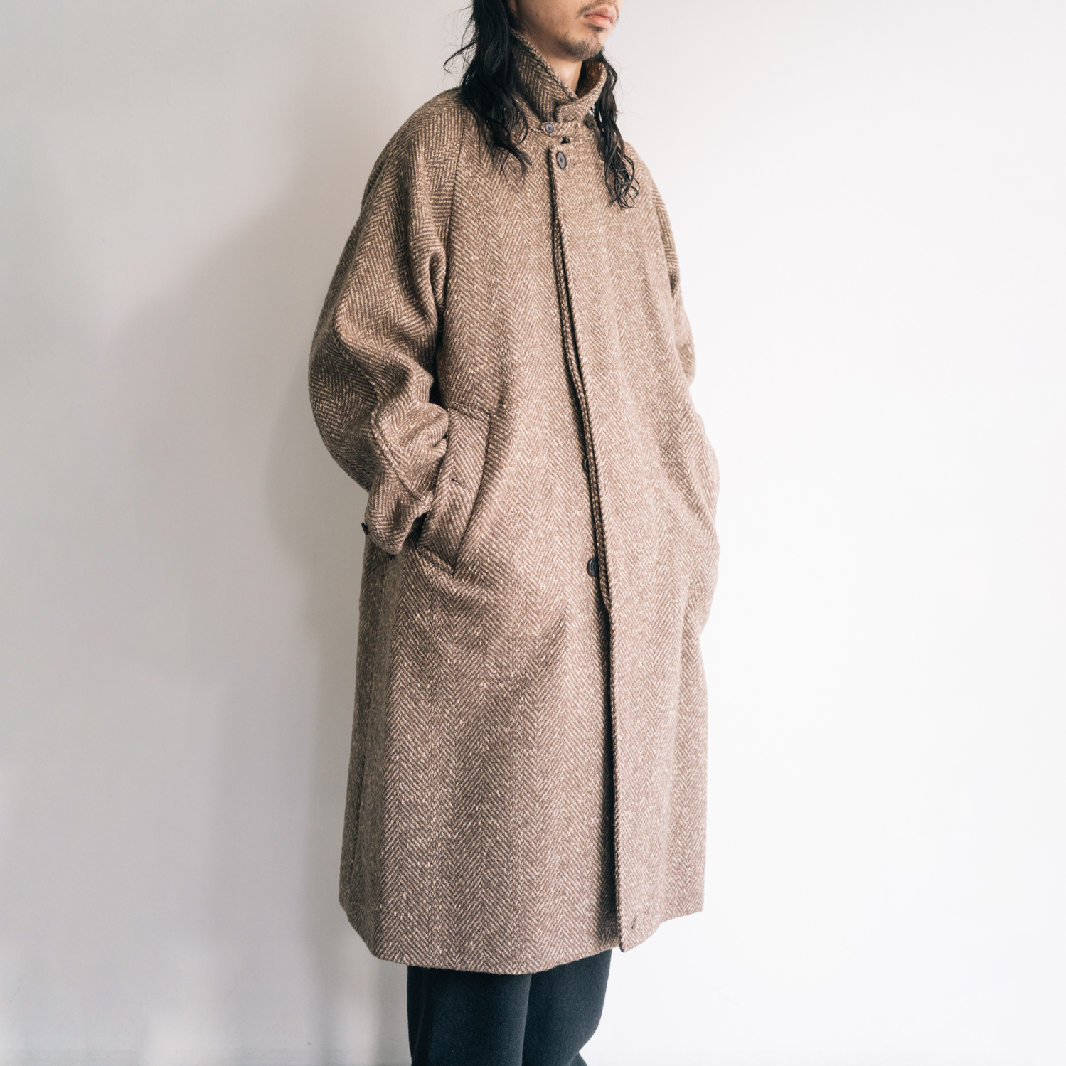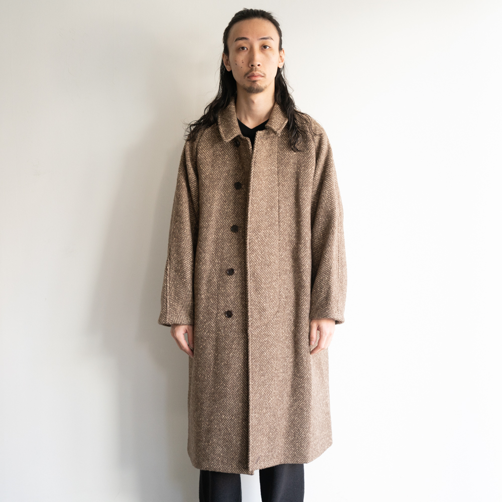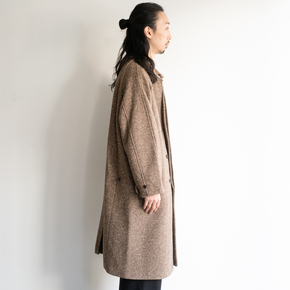 また古き良き時代を彷彿させるかのようなクラシカルな佇まいを持つざっくり編みの太番手ヘリンボーンが目を引く。 4種の糸で構成し織り上げている為、表面の凹凸感が他にない存在感を醸し出します。 凛々しい表情に相反するかのように軽やかな羽織り心地を持つ。 動く度に布が綺麗に舞うようにと、マテリアルのウエイトにまでOLDJOEの意匠設計を垣間見ることができる。
