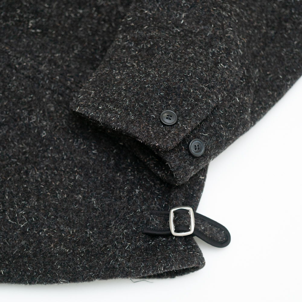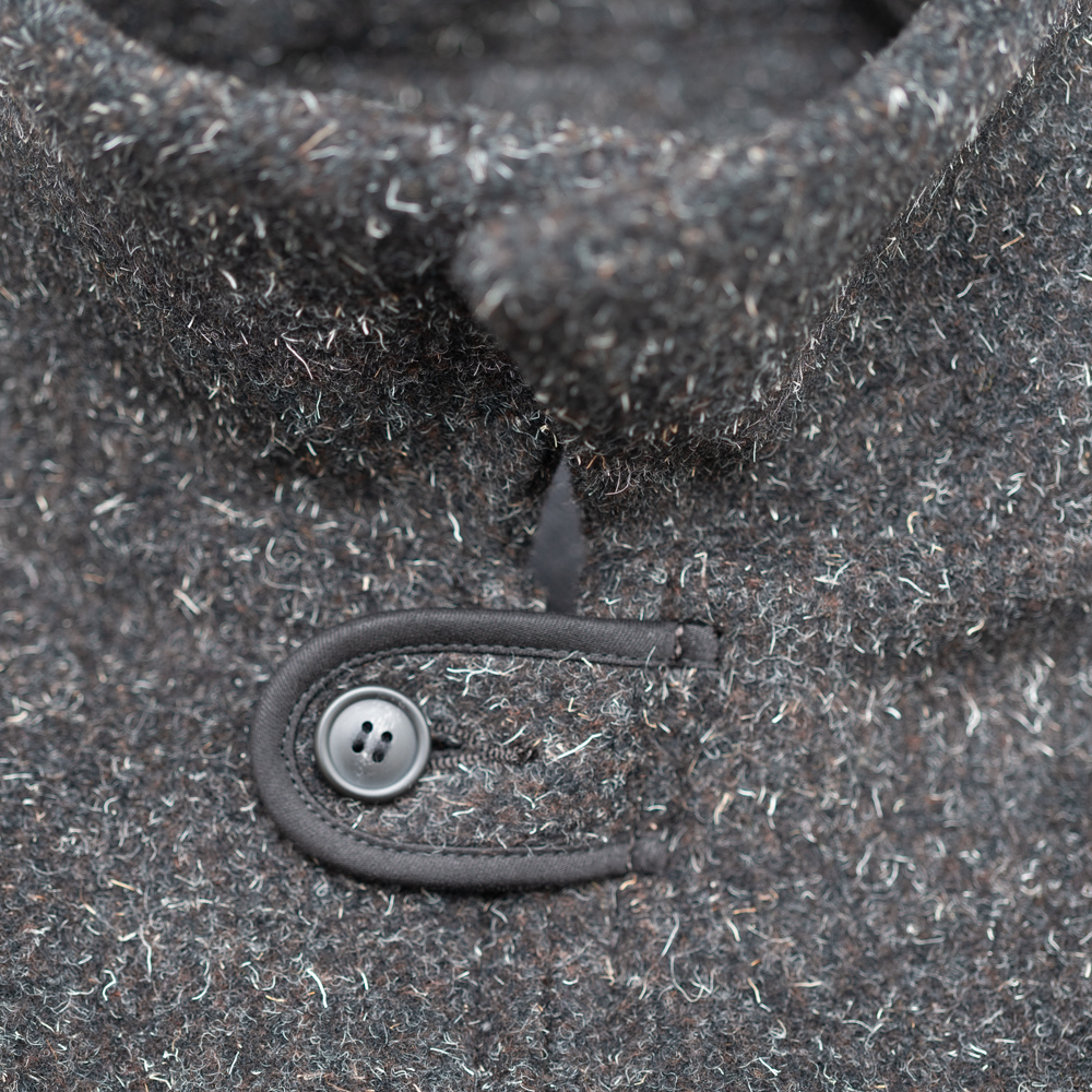 前見頃に配したポケットと弧を描くスレキステッチ、静かに装備される首元のボタンループ、袋縫いで設計された襟など