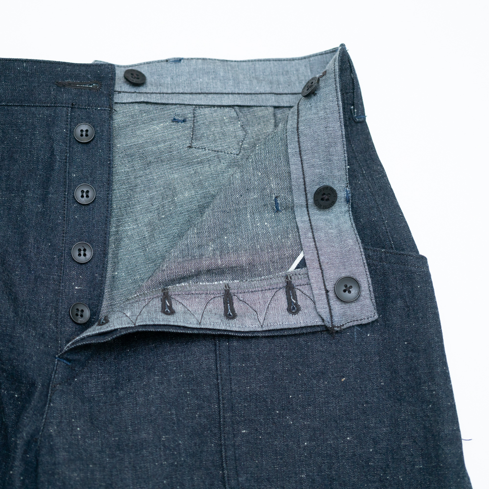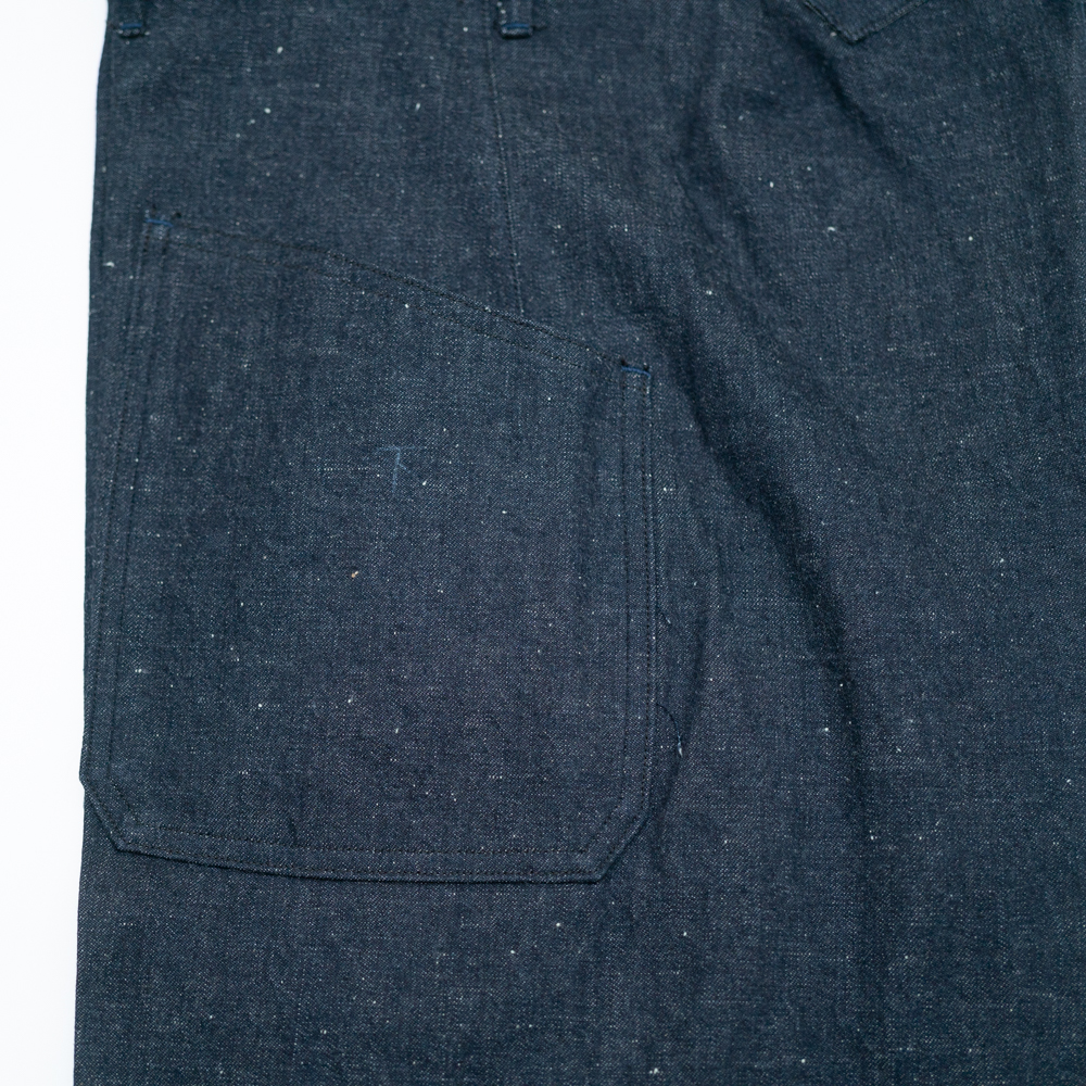 糸に拘り、オリジナルのデシネップを使用しています、 タテ糸は、デニム本来の素朴さやドライ感、バルキー感を表現するために繊維長の短めの綿も混ぜ込んで糸をつくりました。ヨコ糸は、米綿をメインにオーストラリア、ブラジル綿とブレンドし、安定した質感を目指し、また追燃することにより柔らかさの中にシャリ感をだしています。ロープ染色は黒味の強いインディゴ染料で染色し、深い色目を表現しています。 生地はいわゆるキバタと言われる織り上がった状態のものから、特殊な方法でサンフォライズ(防縮加工)のみをかけています。キバタの風合いを損なわず、表面の毛羽感も残しました。