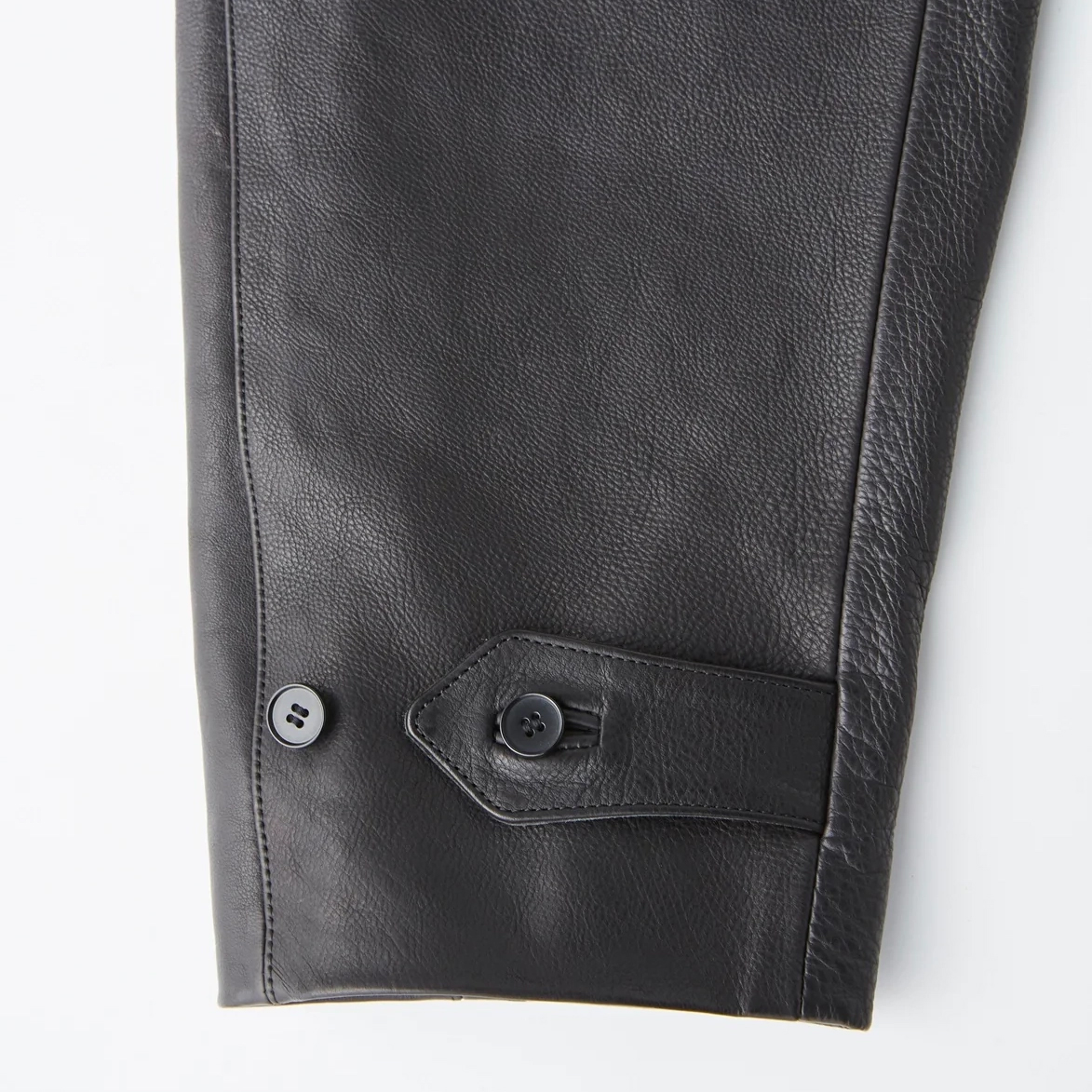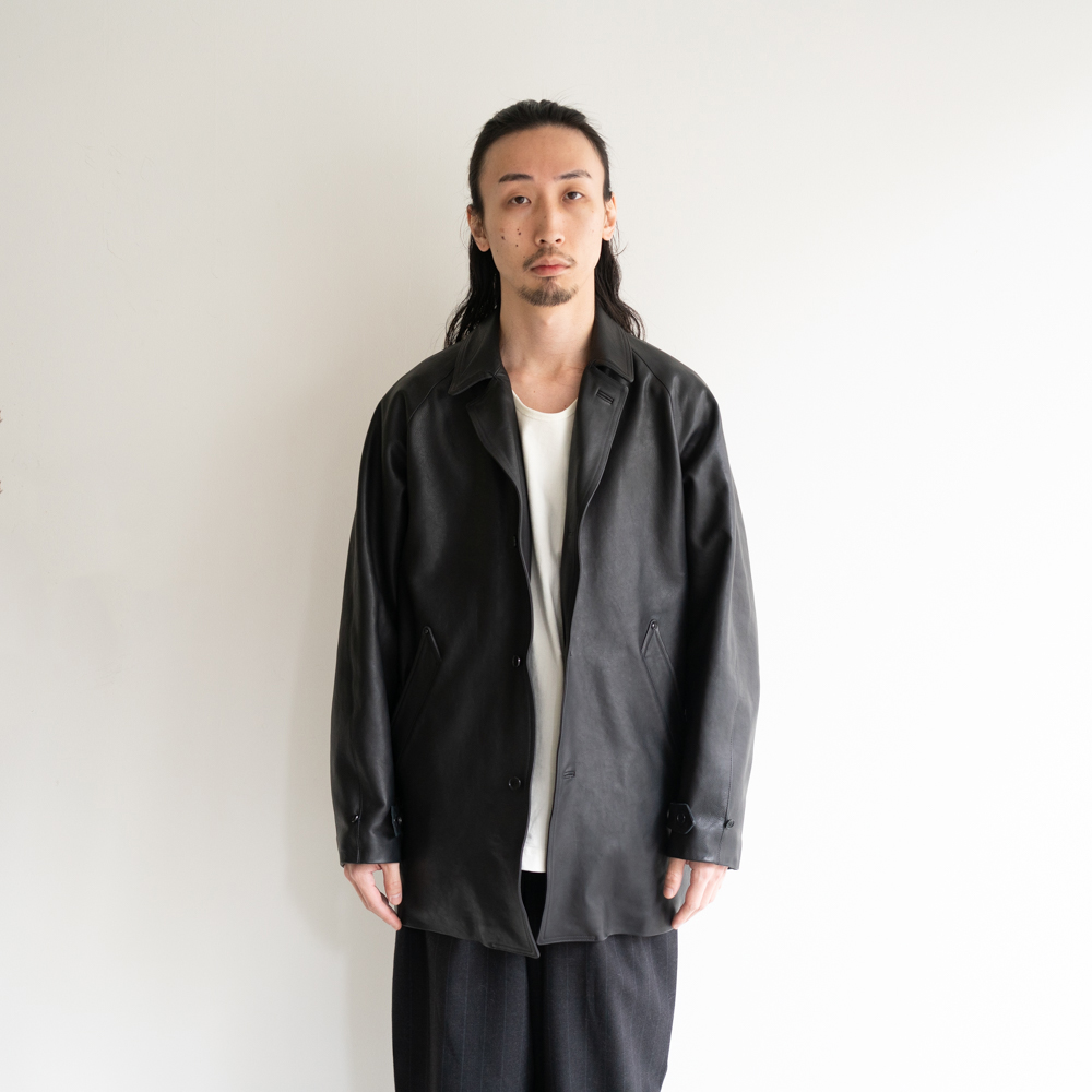 ミドルレングスの前見頃に配される鋭角に角度がついたウェルトポケットに職人技が光る玉縁ホール、
