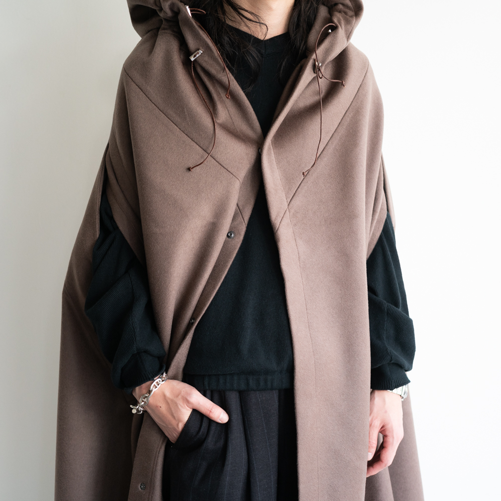ヨーロッパのミリタリーポンチョからインスピレーションを得て制作した、ウールカシミアのマント。