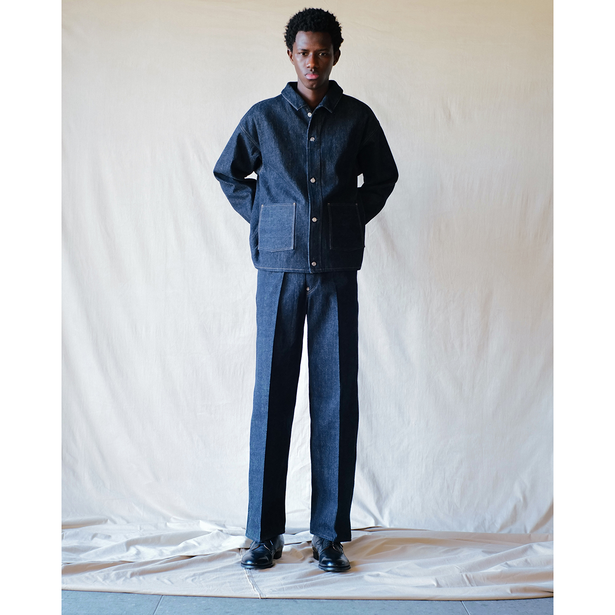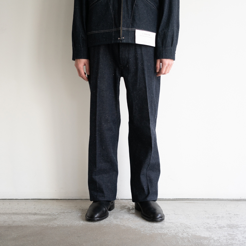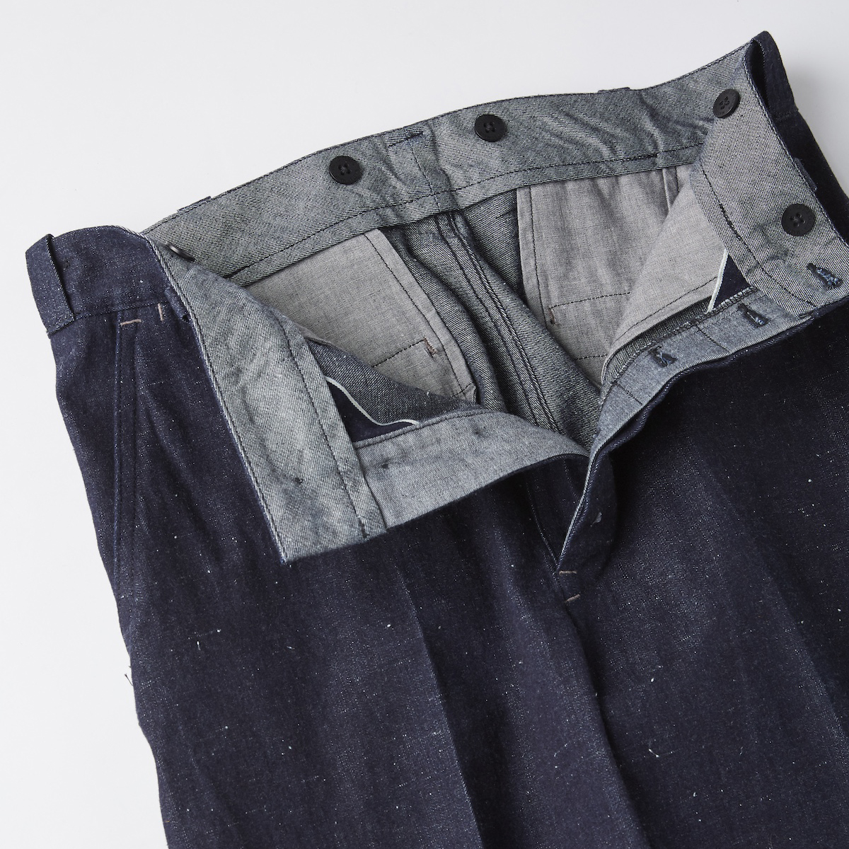 糸に拘り、オリジナルのデシネップを使用しています、 タテ糸は、デニム本来の素朴さやドライ感、バルキー感を表現するために繊維長の短めの綿も混ぜ込んで糸をつくりました。ヨコ糸は、米綿をメインにオーストラリア、ブラジル綿とブレンドし、安定した質感を目指し、また追燃することにより柔らかさの中にシャリ感をだしています。ロープ染色は黒味の強いインディゴ染料で染色し、深い色目を表現しています。 生地はいわゆるキバタと言われる織り上がった状態のものから、特殊な方法でサンフォライズ(防縮加工)のみをかけています。キバタの風合いを損なわず、表面の毛羽感も残しました。