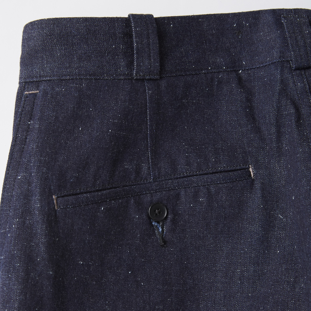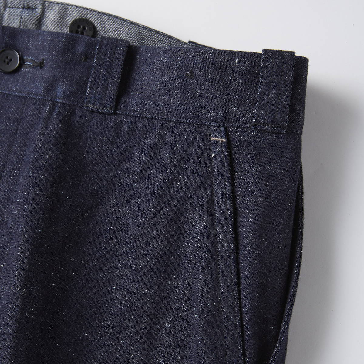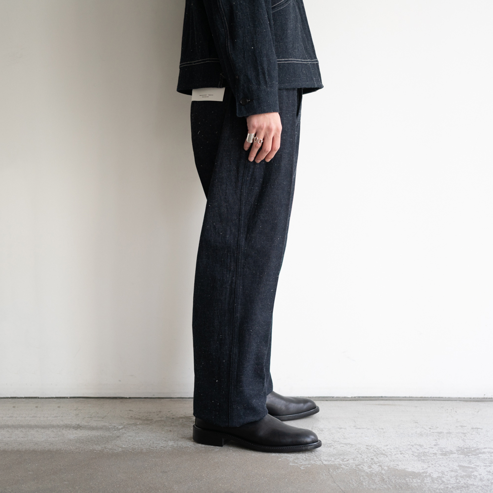 糸に拘り、オリジナルのデシネップを使用しています、 タテ糸は、デニム本来の素朴さやドライ感、バルキー感を表現するために繊維長の短めの綿も混ぜ込んで糸をつくりました。ヨコ糸は、米綿をメインにオーストラリア、ブラジル綿とブレンドし、安定した質感を目指し、また追燃することにより柔らかさの中にシャリ感をだしています。ロープ染色は黒味の強いインディゴ染料で染色し、深い色目を表現しています。 生地はいわゆるキバタと言われる織り上がった状態のものから、特殊な方法でサンフォライズ(防縮加工)のみをかけています。キバタの風合いを損なわず、表面の毛羽感も残しました。