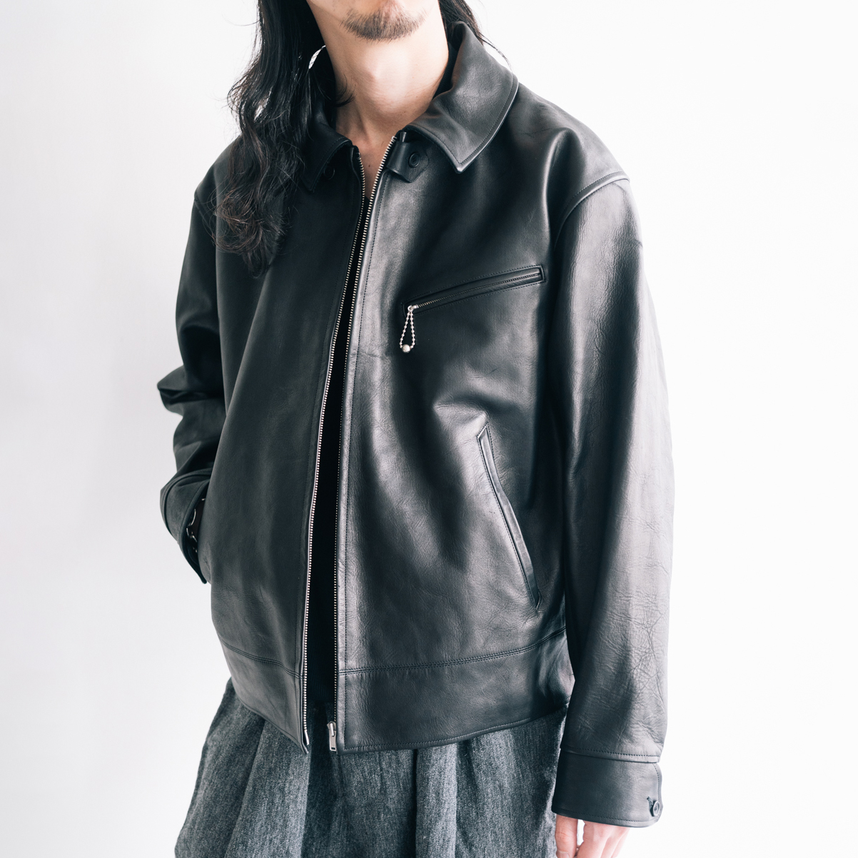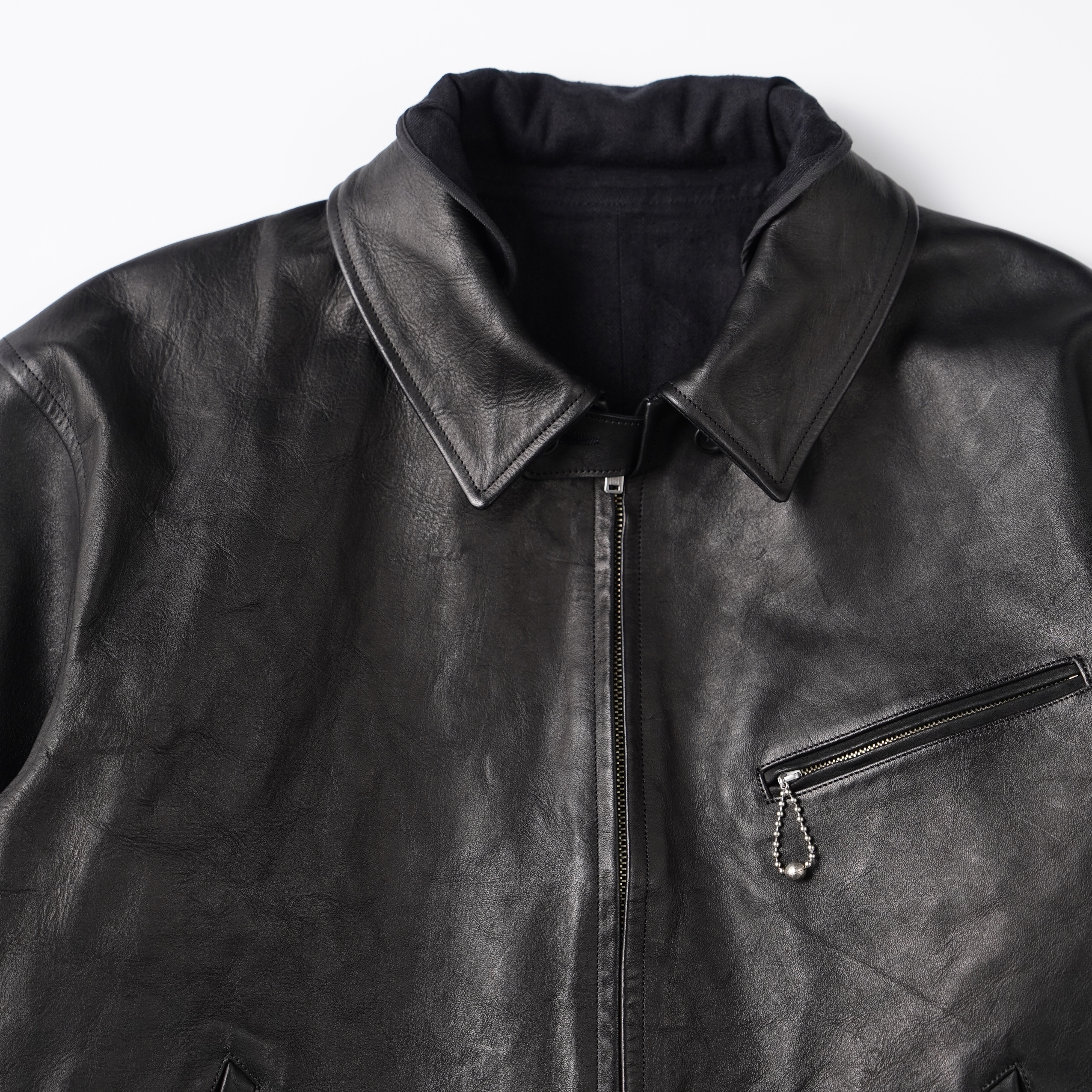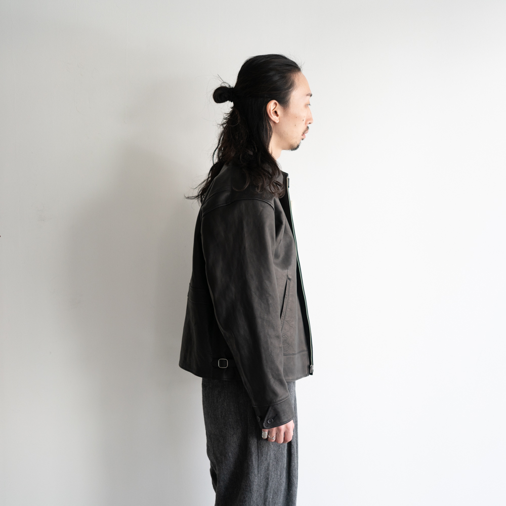 レザーアーカイブの黎明期でもある1920〜30年代のプロダクトの中でも、特に名物として知られるスポーツジャケット、チンタブにネックフラップ、オリジナルで型起こししたハンマーフィニッシュのボールチェーンスライダー、あえてユーロな佇まいを見せる襟回しのシルエットなど、シンプルな中に乙な意匠が詰まったトップクオリティピース。