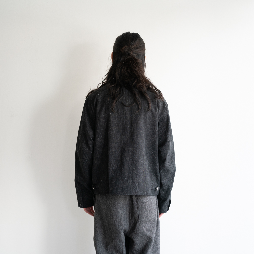 ジャスペヤーンを用いて織り上げたハケ目組織とストライプは、古き良き表情と奥行きのある表情を持つ。