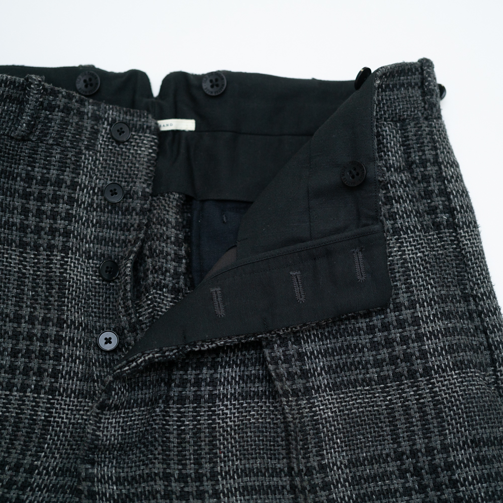 深い股上と、ゆとりを持たせたもも周り、ワイドなわたり巾から膝から裾まで絞れる事ない綺麗なストレートラインは革靴やブーツは勿論、スニーカーなどとの相性も良くサスペンダーで吊るして履くと、ハイウエストで更に綺麗な脚のラインをキープしてくれます。